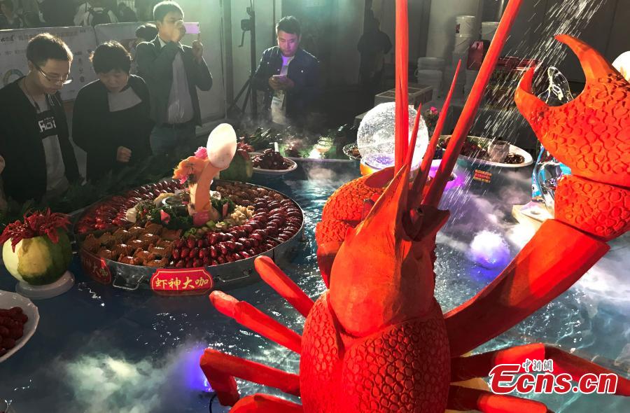Crayfish cooked in different ways are on show at a cuisine event in Nanjing City, the capital of East China’s Jiangsu Province, Oct. 12, 2017. Crayfish is a popular delicacy in China. (Photo: China News Service/Yang Bo)