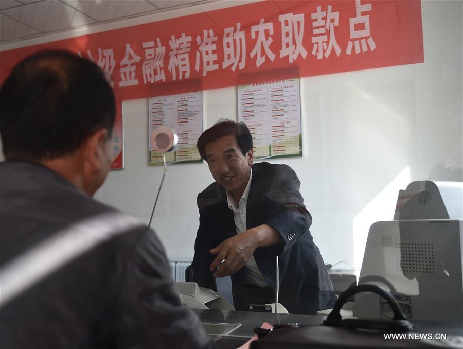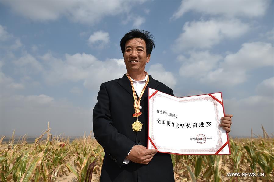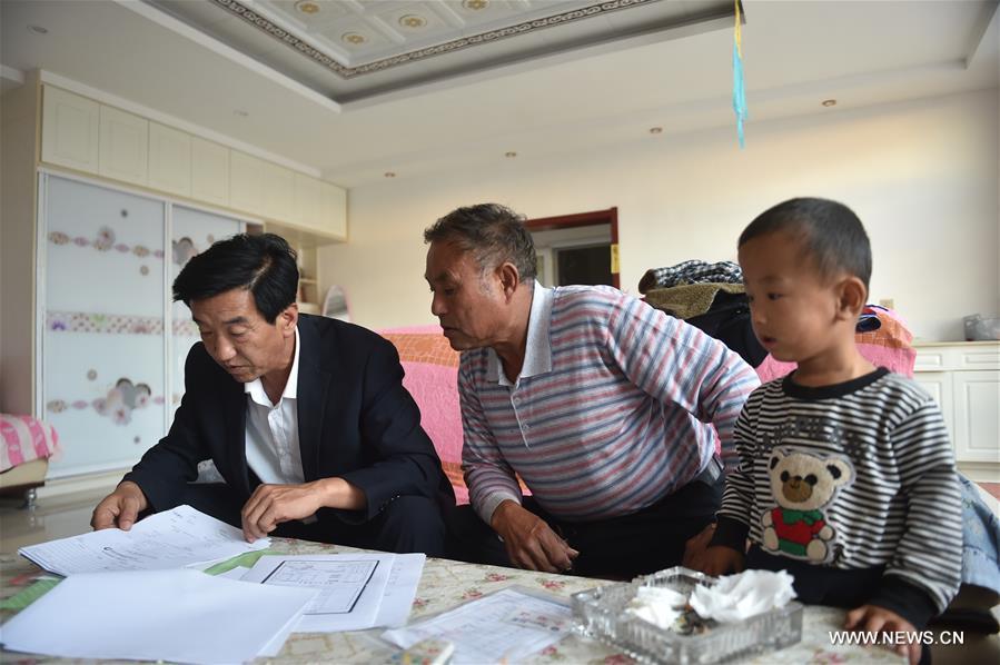 Zhu Yuguo (R), secretary of the Communist Party of China (CPC) branch of Zengjipan Village, visits a construction set of feed processing plant at Zengjipan Village of Yanchi County, northwest China's Ningxia Hui Autonomous Region, Oct. 20, 2016. The 55-year-old Zhu Yuguo helped banks to set banking outlets in the village and managed the mutual aid fund for development in the village. (Xinhua/Li Ran)