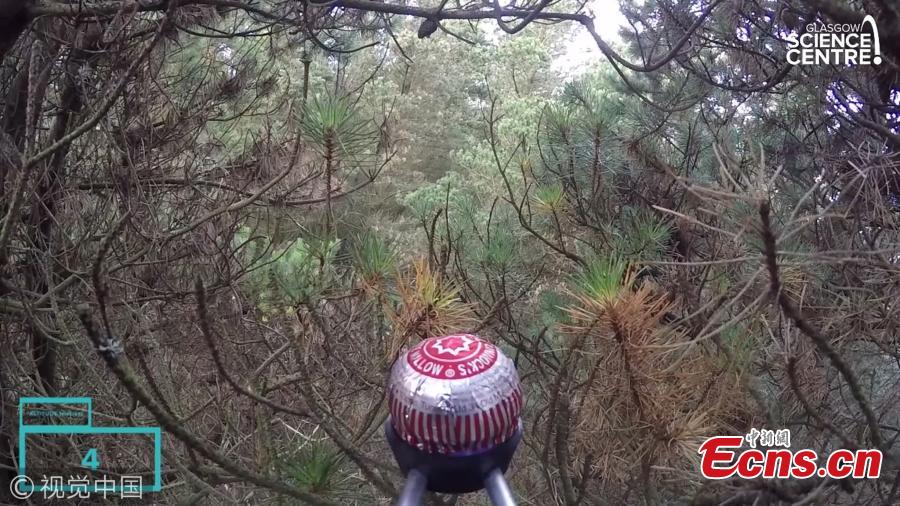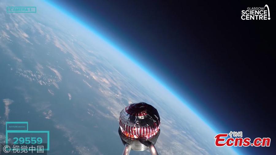 A team at the Glasgow Science Centre (GSC) launched a Tunnock's Teacake, nicknamed Terry, into space in a fun experiment in Houston, Renfrewshire, Oct. 13, 2017, to spark interest in science. The Scottish confectionery took one hour 29 minutes to hit a peak altitude of 37,007 meters. It then took 40 minutes to return to Earth, landing in a tree in Galloway Forest Park. A camera attached to a hydrogen weather balloon broadcast Facebook Live images. (Photo/VCG)