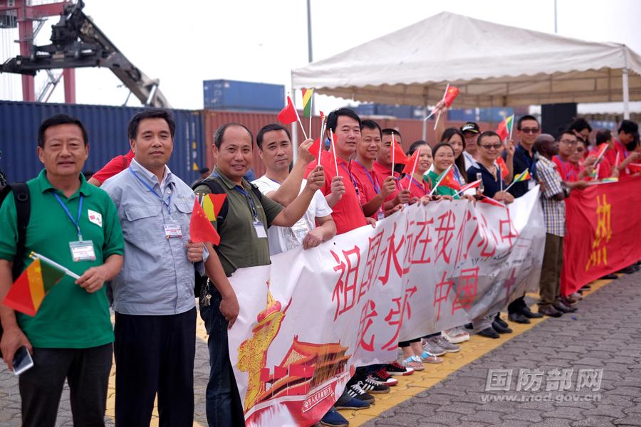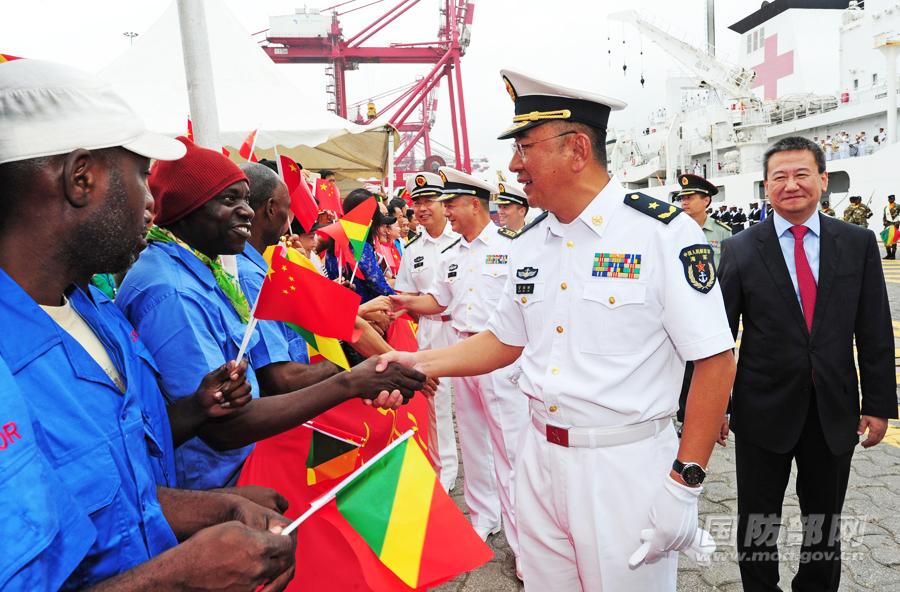 Accompanied by Chinese Ambassador to the Republic of Congo Xia Huang, commanding officers of the "Harmonious Mission 2017" of the Chinese naval hospital ship Peace Ark shake hands with local people at the Port of Pointe-Noire, the Republic of Congo, October 17, 2017. (Photo/mod.gov.cn)