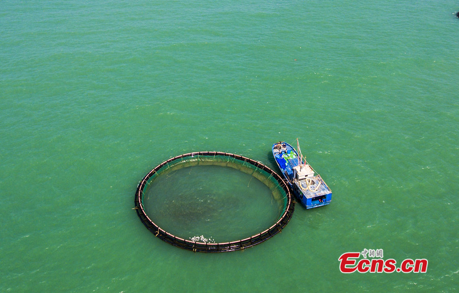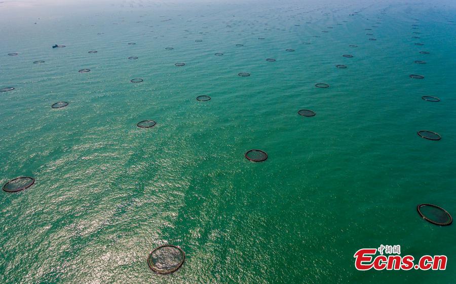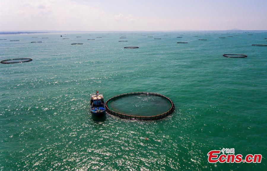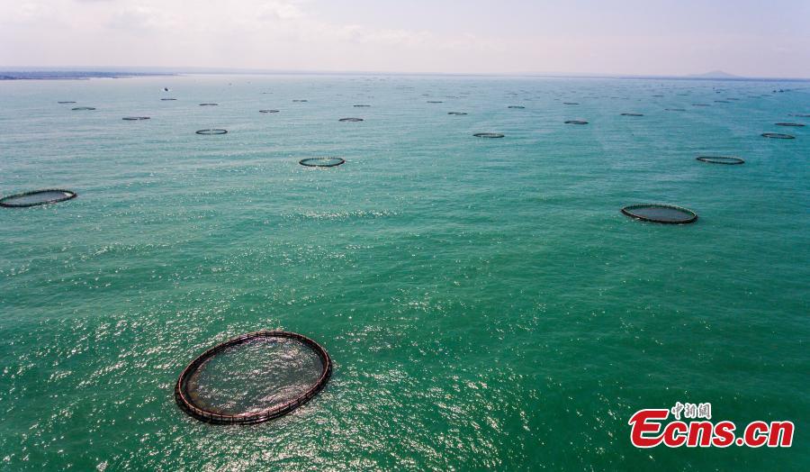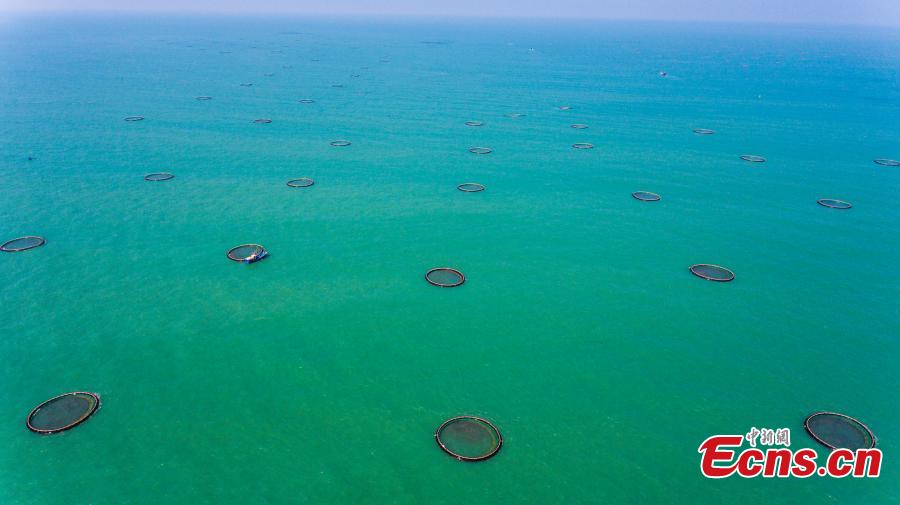 Pictures taken by a drone show cages being used for aquaculture projects floating in a bay in Lingao County, South China’s Hainan Province, Oct. 19, 2017. The county has more than 3,000 cages for deep-water aquaculture farming and produces an annual output of 24,000 tons of fish, with a market value of 720 million yuan ($109 million). Lingao County has Asia’s largest deep-water cage farming base. (Photo: China News Service/Luo Yunfei)