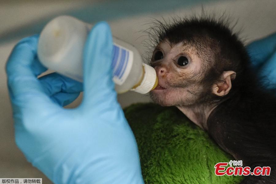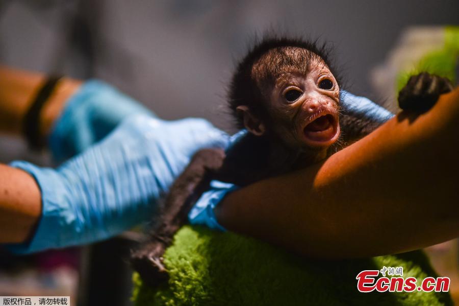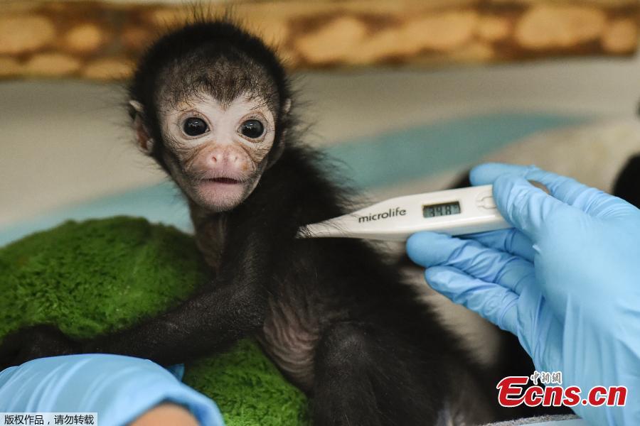 Olivia, a 25-day-old spider monkey which apparently fell a couple of meters and whose mother wouldn't let anyone near when she was found unconscious about a week ago, receives assistance at the clinic of Cali's zoo, in Colombia, Oct. 19, 2017. (Photo/Agencies)
