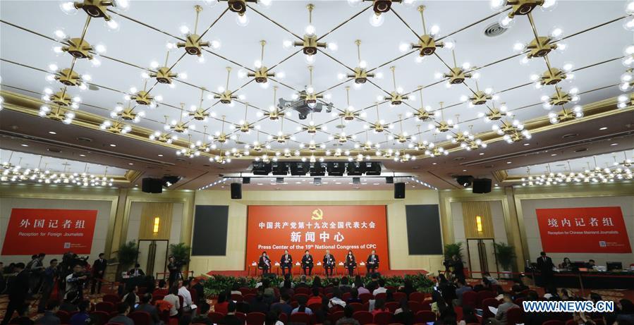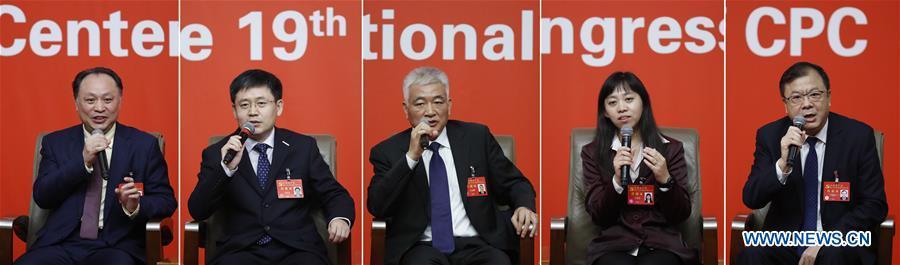 The press center of the 19th National Congress of the Communist Party of China (CPC) holds a group interview on implementing the strategy of innovation-driven development in Beijing, capital of China, Oct. 20, 2017. Wang Zhigang (3rd R), Vice Minister of Science and Technology and secretary of the leading Party group within the ministry, Wang Xiujie (2nd R), director of the Center of Molecular Systems Biology of the Institute of Genetics and Developmental Biology (IGDB) of the Chinese Academy of Sciences (CAS), Wang Endong (3rd L), chief scientist of the Inspur Group and an academician of the Chinese Academy of Engineering, Lu Jianjun (1st R), secretary of the Working Committee on Science and Technology of the CPC Shaanxi Provincial Committee and head of the Shaanxi Science and Technology Department, and Jiang Fengyi (2nd L), vice president of Nanchang University, received the group interview. (Xinhua/Shen Bohan)