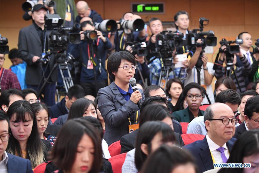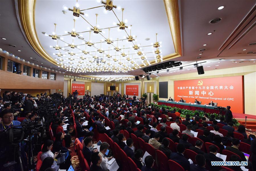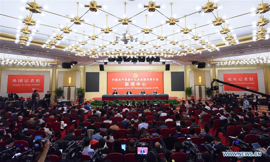 The press center of the 19th National Congress of the Communist Party of China (CPC) holds a press conference on promoting the steady, healthy and sustainable development of Chinese economy, in Beijing, capital of China, Oct. 21, 2017. Director He Lifeng (2nd L), vice directors Zhang Yong (2nd R) and Ning Jizhe (1st R) of China's National Development and Reform Commission attended the press conference. (Xinhua/Zhang Yuwei)