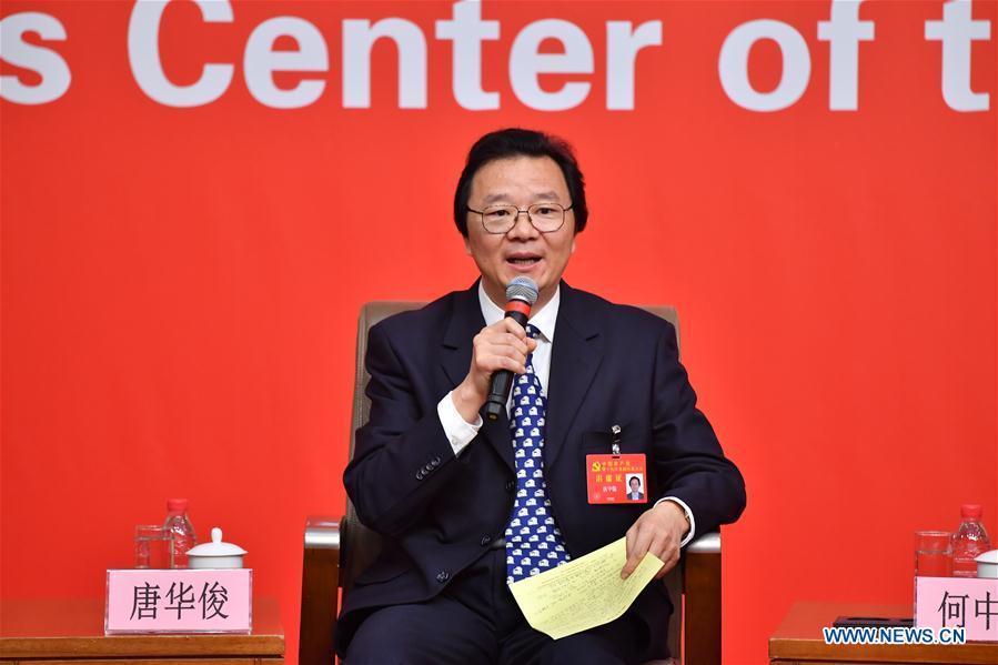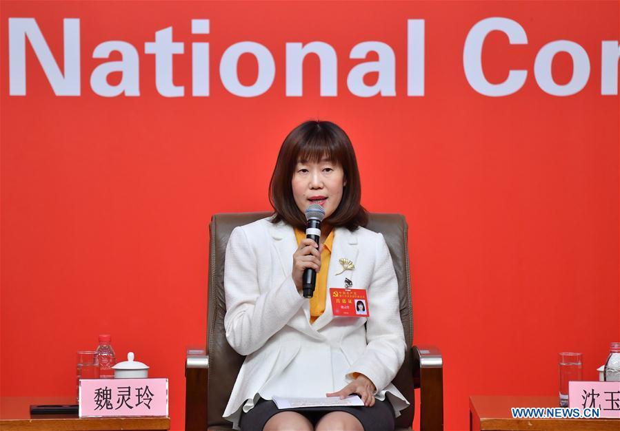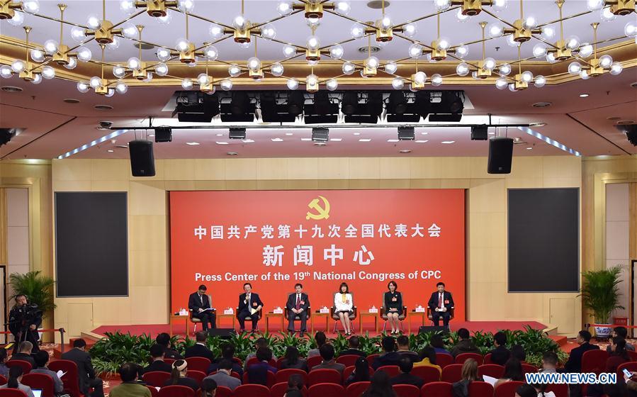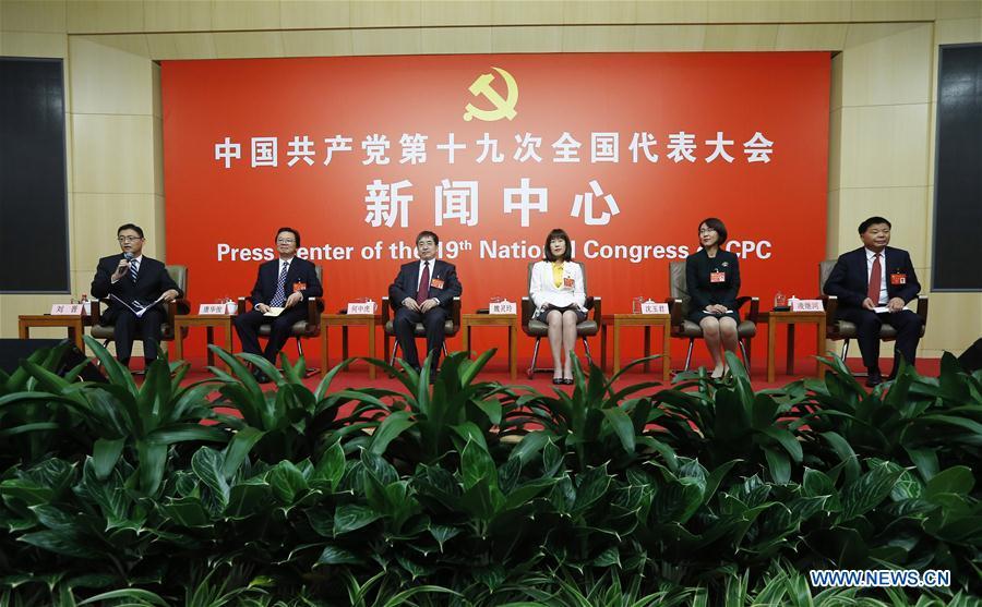 The press center of the 19th National Congress of the Communist Party of China (CPC) holds a group interview on innovation in agricultural science and technology in Beijing, capital of China, Oct. 21, 2017. Tang Huajun, member of the leading Party group of the Ministry of Agriculture, also president of the Chinese Academy of Agricultural Sciences (CAAS) and academician of the Chinese Academy of Engineering, He Zhonghu, research fellow at the Institute of Crop Sciences of the CAAS and director of the National Wheat Improvement Center, Wei Lingling, research fellow at the Institute of Environment and Sustainable Development in Agriculture of the CAAS and director of the Key Laboratory of Leisure Agriculture under the Ministry of Agriculture, Shen Yujun, deputy director of the Institute of Rural Energy and Environmental Protection of the Chinese Academy of Agricultural Engineering (CAAE) under the Ministry of Agriculture, and Ling Jihe, a farmer from Anyi County of Jiangxi Province, were present at the group interview. (Xinhua/Zhang Yuwei)