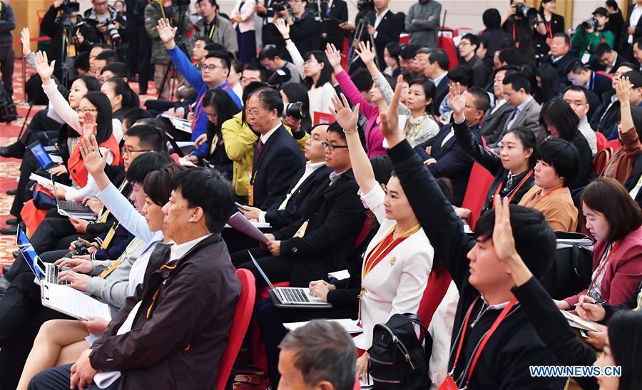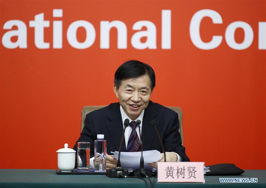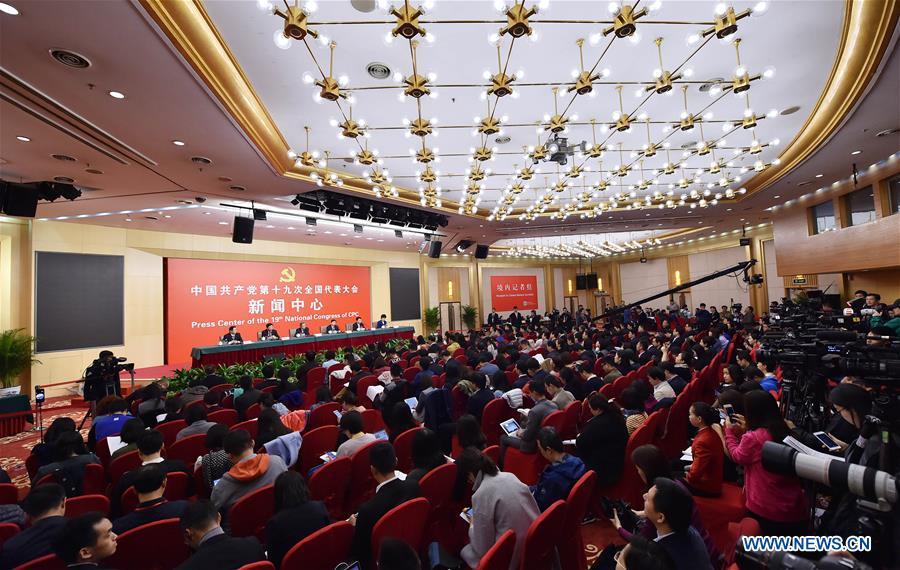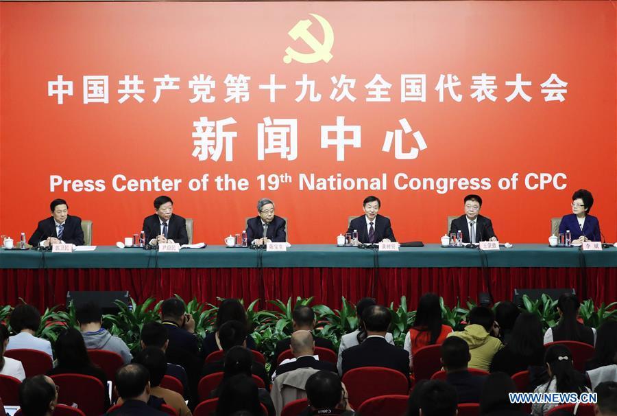 The press center of the 19th National Congress of the Communist Party of China (CPC) holds a press conference on securing and improving people's livelihood, in Beijing, capital of China, Oct. 22, 2017. China's Minister of Education Chen Baosheng (3rd L), Minister of Civil Affairs Huang Shuxian (3rd R), Minister of Human Resources and Social Security Yin Weimin (2nd L), Minister of Housing and Urban-Rural Development Wang Menghui (2nd R), and Minister of National Health and Family Planning Commission Li Bin (1st R) attended the press conference. (Xinhua/Shen Bohan)