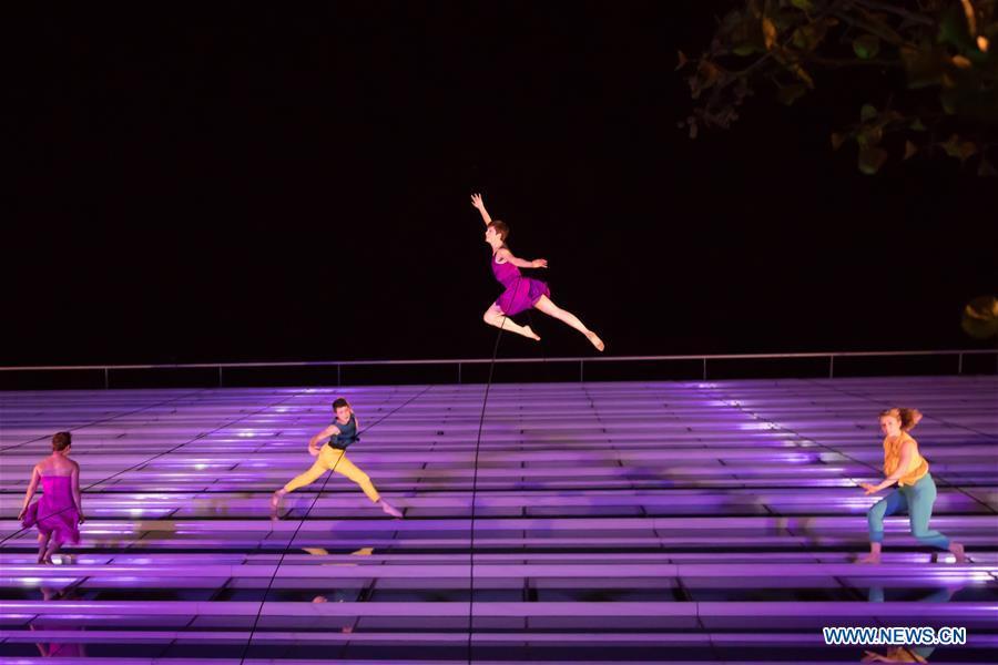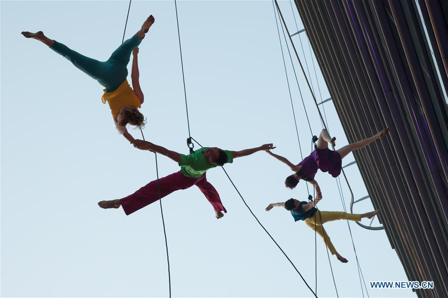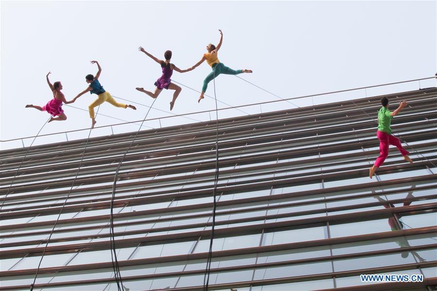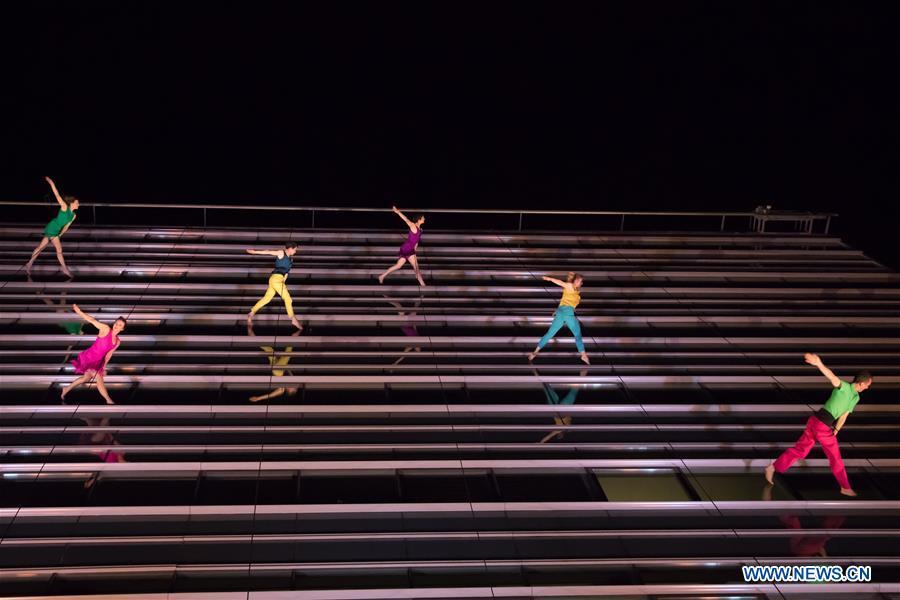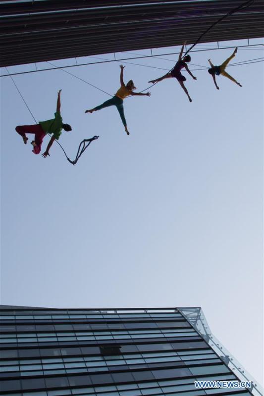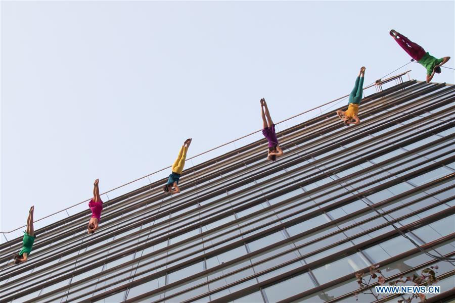 Members of the Vertical Dance Company BANDALOOP from the United States perform on the glass wall of an office building during the CAFe Budapest Contemporary Arts Festival in Budapest, Hungary, on Oct. 20, 2017. (Xinhua/Attila Volgyi)