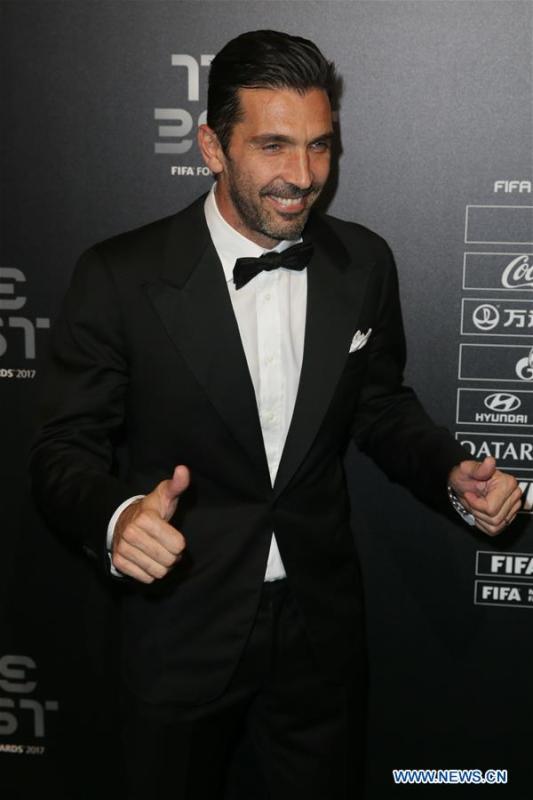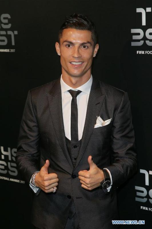 Real Madrid's Cristiano Ronaldo (L) wins The Best FIFA Men's Player Award during the Best FIFA Football Awards 2017 in London, Britain, Oct. 23, 2017. (Xinhua/Wang Zijiang)