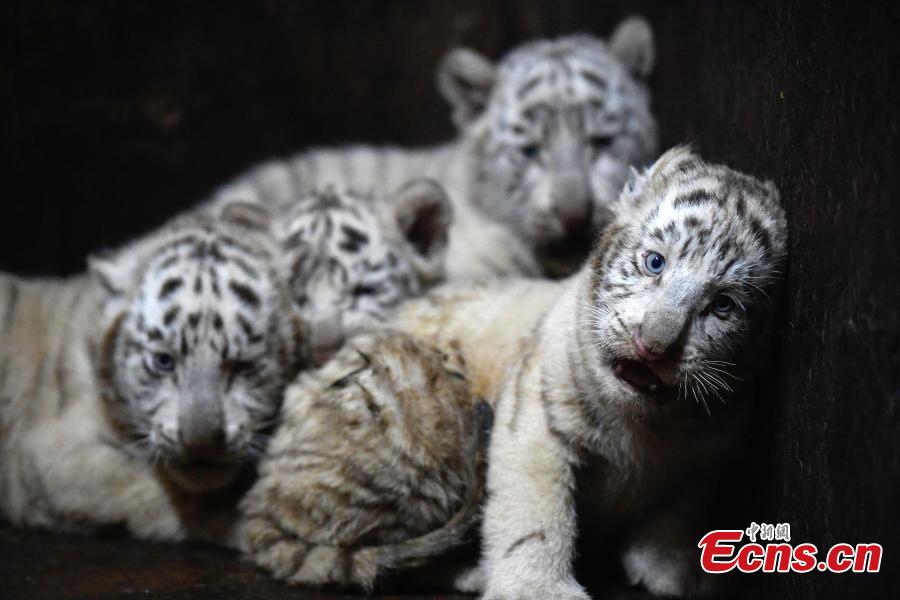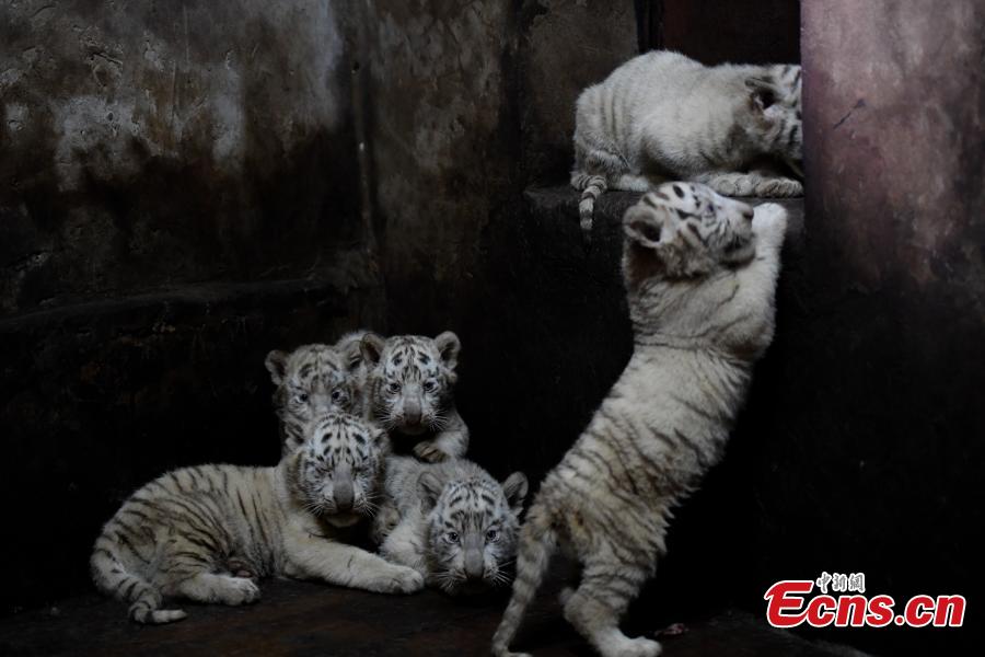Five of the white tiger sextuplets are seen at a Yunnan zoo in Kunming, capital of southwest China's Yunnan Province on October 25, 2017. According to the zoo, white tigers usually give birth to two or three cubs, sextuplets are considered very rare. (Photo: China News Service/Liu Ranyang)