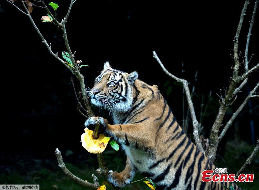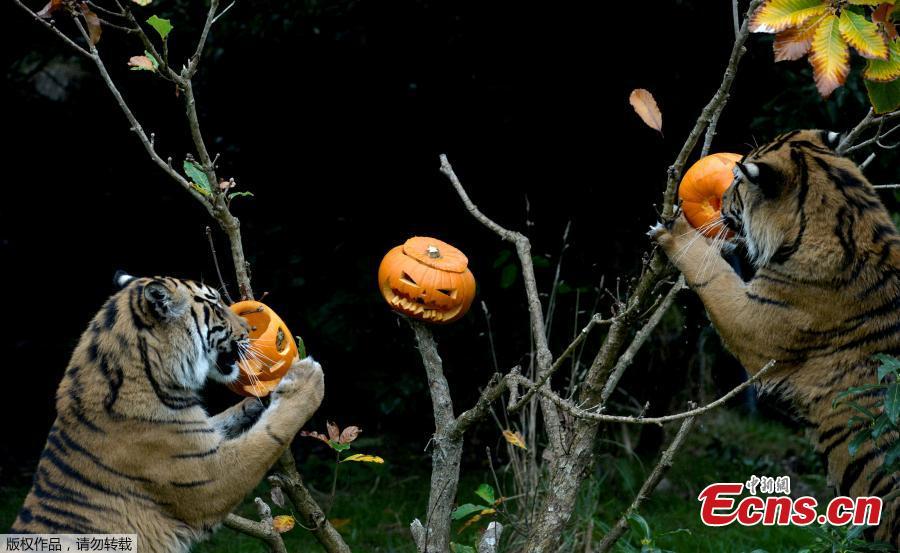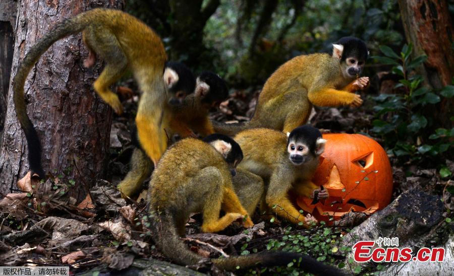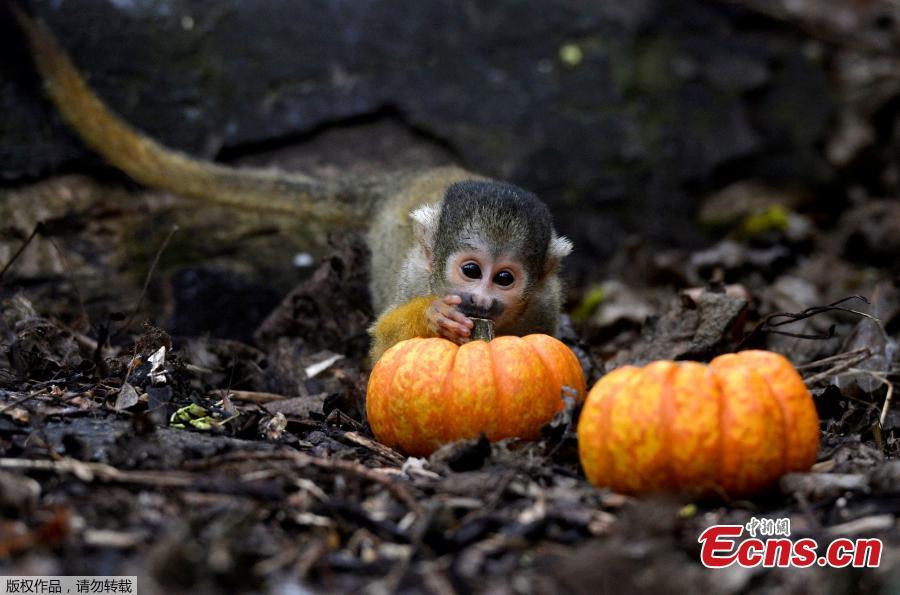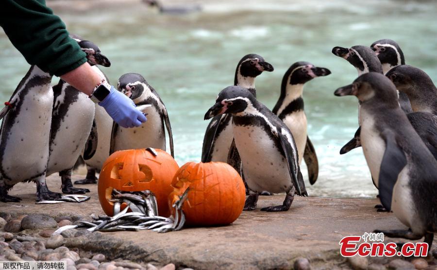 A Humboldt Penguin and a carved pumpkin at a Halloween event at ZSL London Zoo, London, Britain, Oct. 26, 2017. (Photo/Agencies)