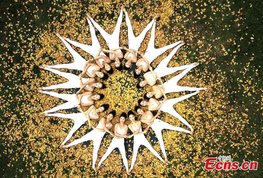 Fifteen yoga lovers make a flower shape on golden leaves of autumn in Jiyuan, Central China's Henan Province, Oct. 27, 2017. (Photo: China News Service/Wang Zhongju)