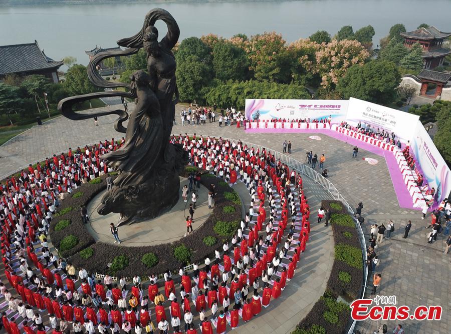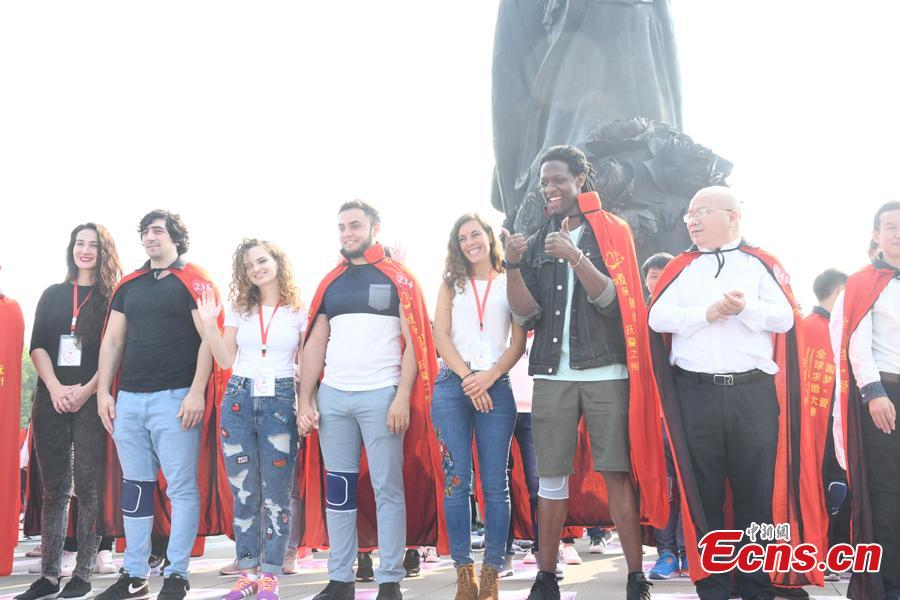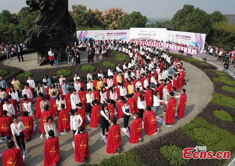 Men propose in relays in Fuzhou City, East China's Jiangxi Province on Oct. 28, 2017. A total 311 couples from more than 10 countries gathered in the city to take part in a "proposal relay", setting a Guinness World Record with the most participants "proposing on one knee". Fuzhou is the hometown of Chinese playwright Tang Xianzu (1550-1616).(Photo: China News Service/Chen Yuanmao)
