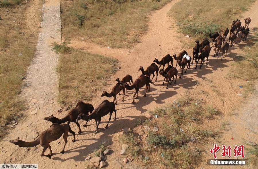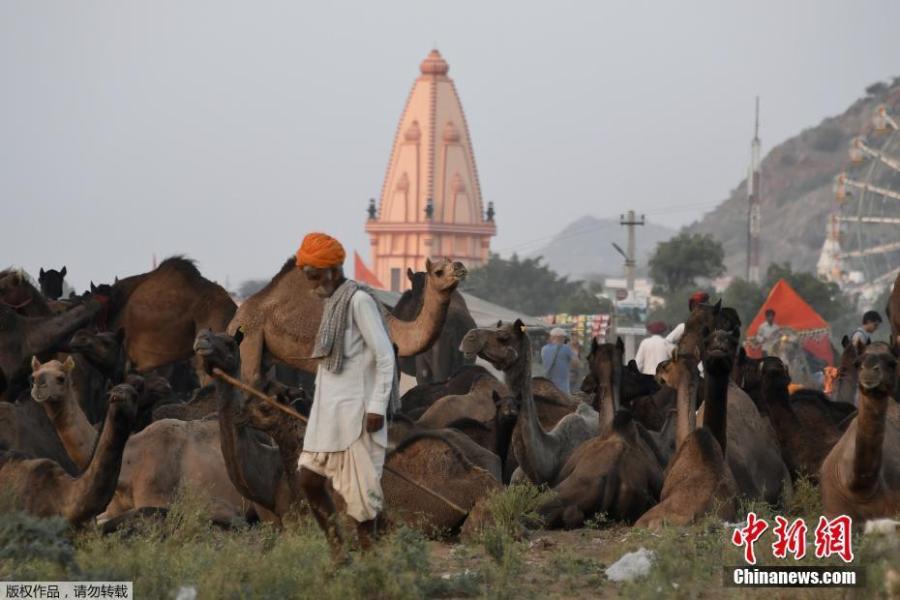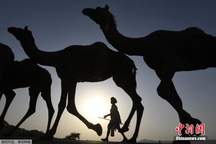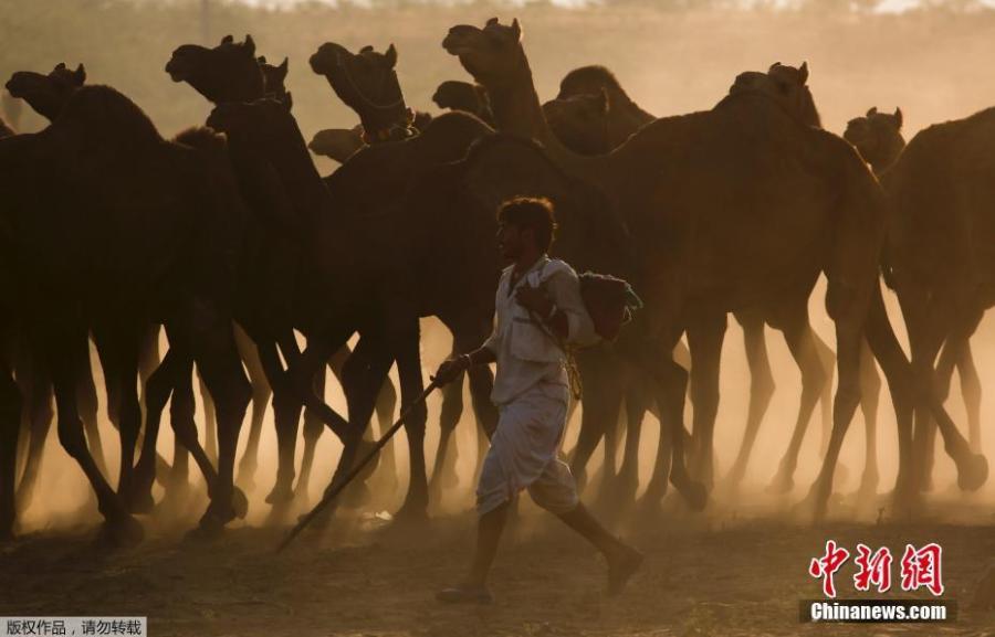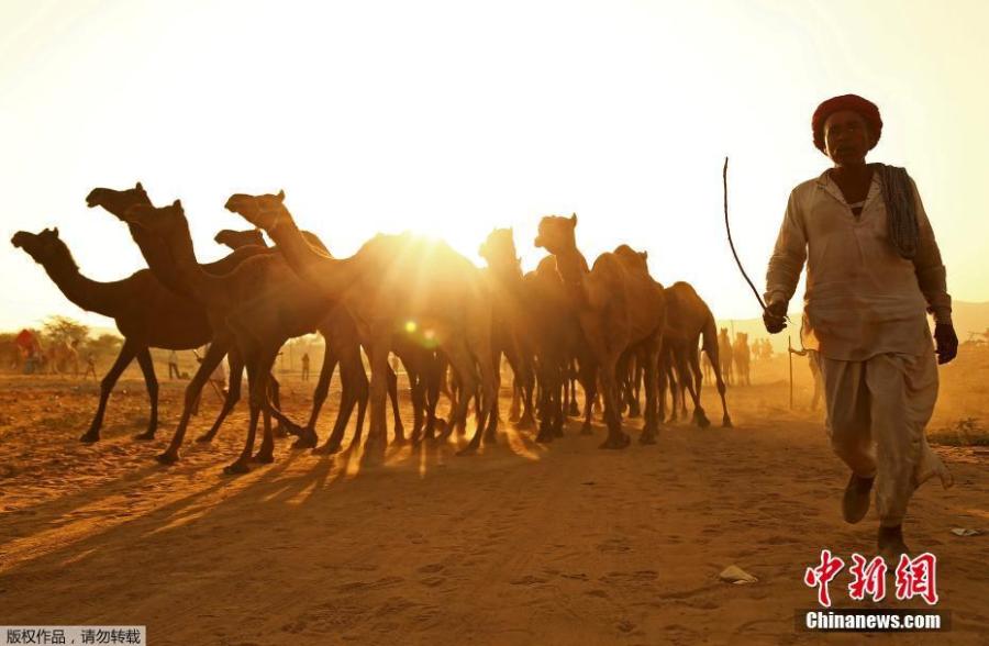 A camel owner walks with his livestock during sunset at the Pushkar Camel Fair in Pushkar in Rajasthan state in India on October 26, 2017. The 100-year-old event is also one of the largest camel fairs in the world. This iconic fair attracts thousands of livestock traders to sell their animals, mainly camels. The fair has also been seeing a steady rise in the number of foreign tourists year on year. (Photo/Agencies)