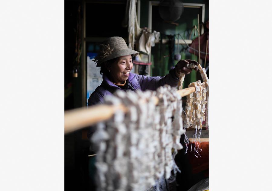 Zhoiger dries the cheese cubes at home in Yumai township, Lhunze county, Southwest China's Tibet autonomous region, on Oct. 29, 2017. (Photo/Xinhua)