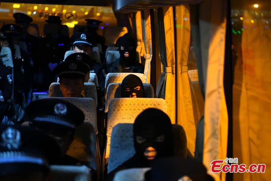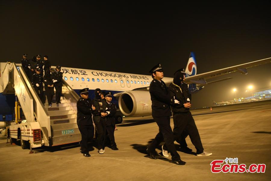 Chinese nationals suspected of involvement in transnational telecom fraud and deported from Cambodia arrive at an airport in Southwest China’s Chongqing Municipality, Oct. 29, 2017, under the escort of Chinese police. (Photo: China News Service/Chen Chao)