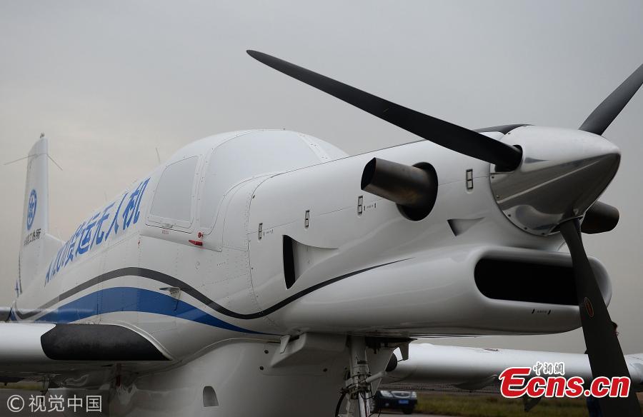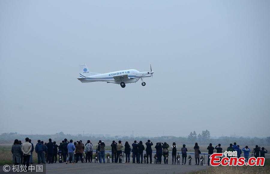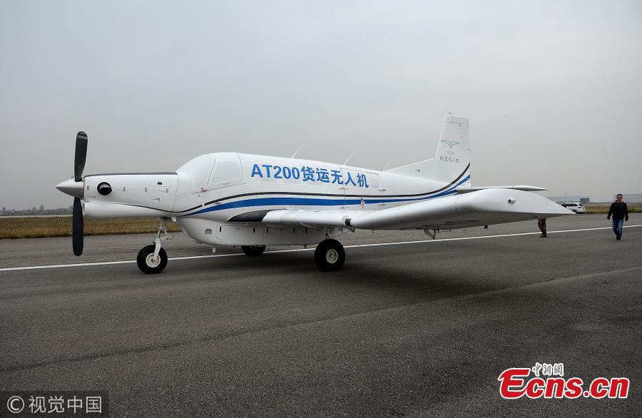 China's heaviest cargo unmanned aerial vehicle (UAV), the AT200, undergoes a test flight in Pucheng County, Northwest China’s Shaanxi Province, Oct. 30, 2017. The AT200 drone, jointly developed by several research institutes and companies, made a successful 28-minute flight. The UAV has a maximum flying speed of 313 km per hour, a flight range of 2,183 kilometers, and a 6,098-meter service ceiling. (Photo/VCG)