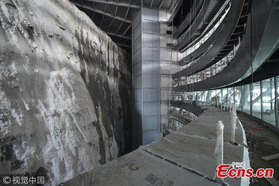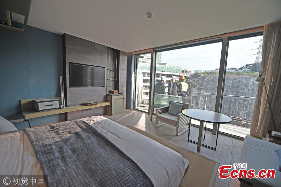 The construction site of a quarry hotel 80 meters below ground in Shanghai's Songjiang District. The quarry hotel is China's first five-star hotel to be built inside an abandoned quarry. Estimated to open in May 2018, the hotel has 370 guest rooms and a total investment of 600 million yuan ($90 million). (Photo/VCG)