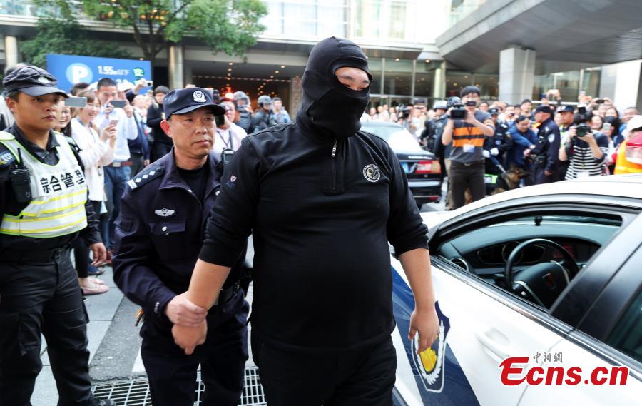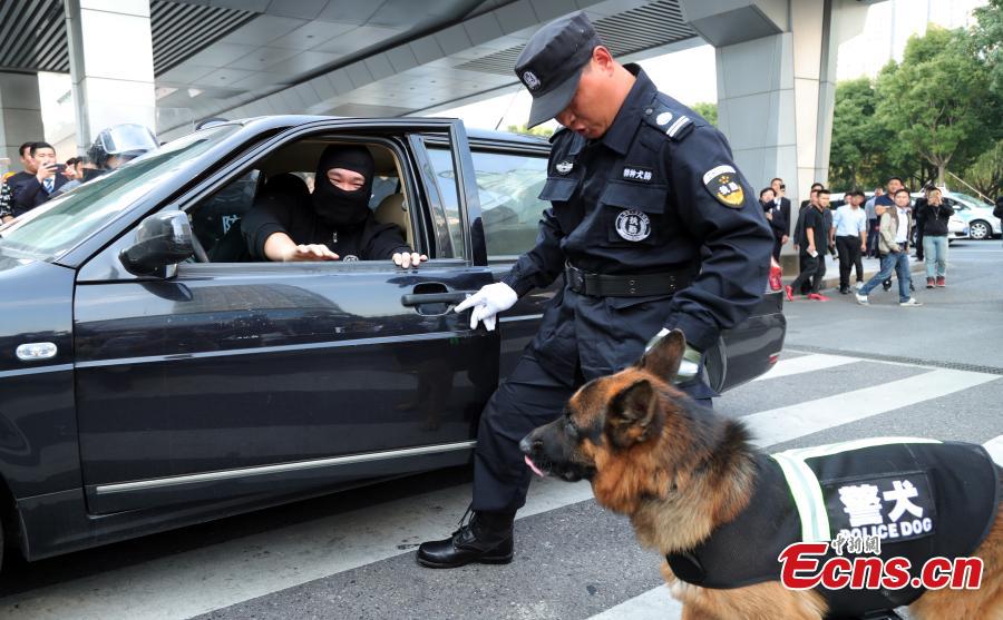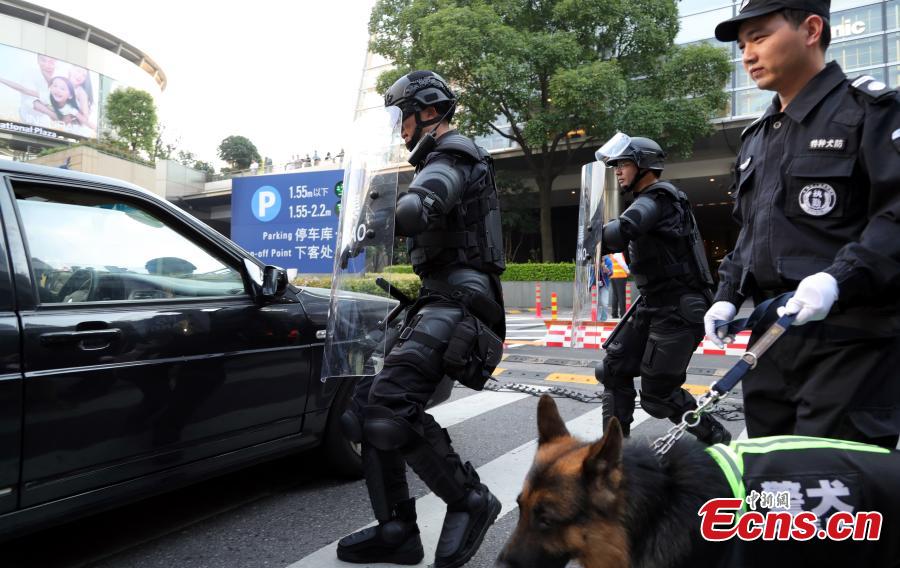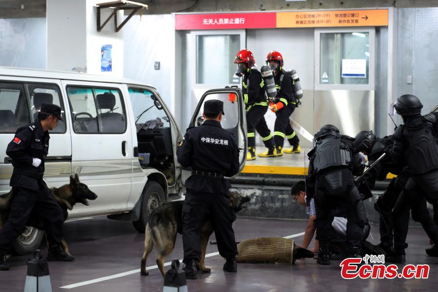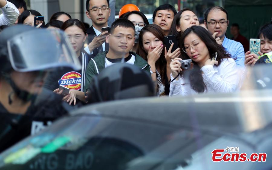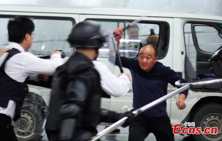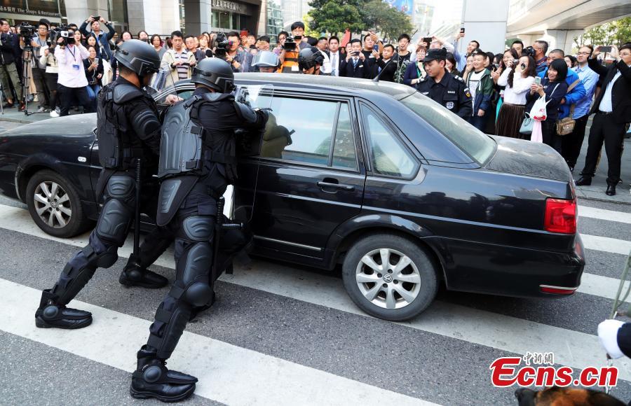 A fire and anti-terrorism drill is held in Shanghai’s second tallest building in Pudong’s Lujiazui area on November 2, 2017 to train workers’ responses in an emergency. The drill at the Shanghai World Financial Center simulated an attempt of two terrorists trying to drive into the building, having started a high-story blaze in the 492-meter-tall skyscraper as a distraction. Some 2,000 employees from 79 firms took part in the drill, which was jointly conducted by the management of the center, along with the anti-terrorism office, police and fire brigade of the Pudong New Area. (Photo: China News Service/Tang Yanjun)