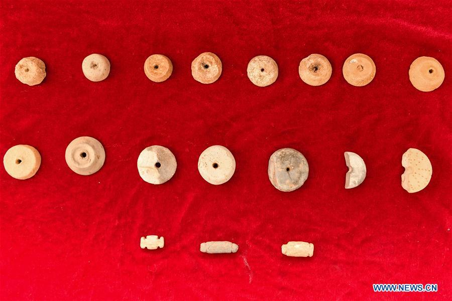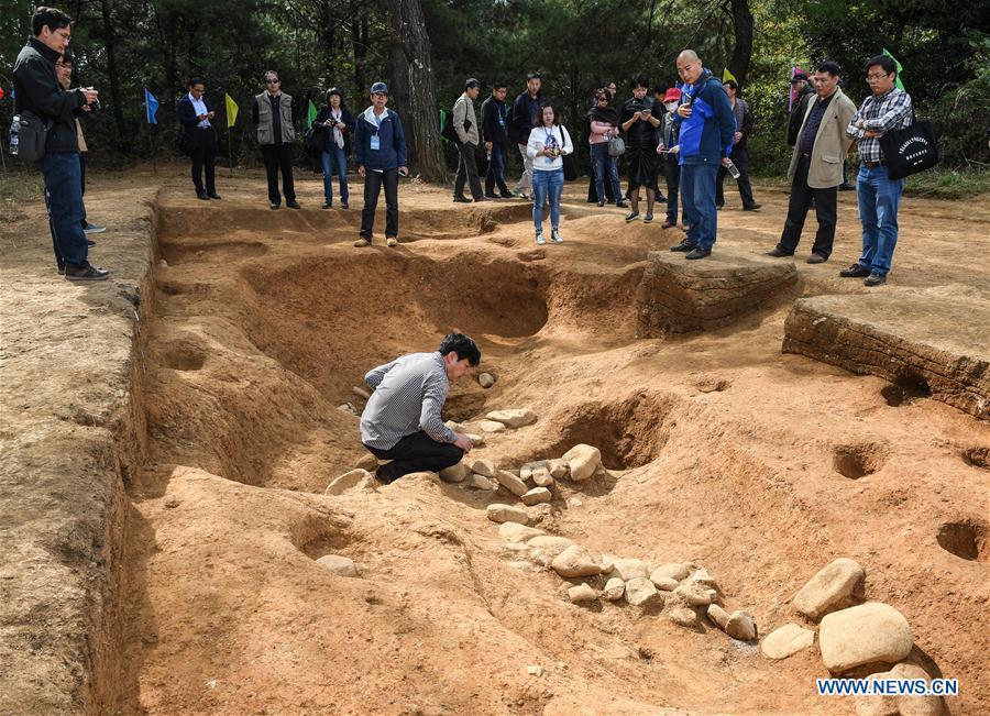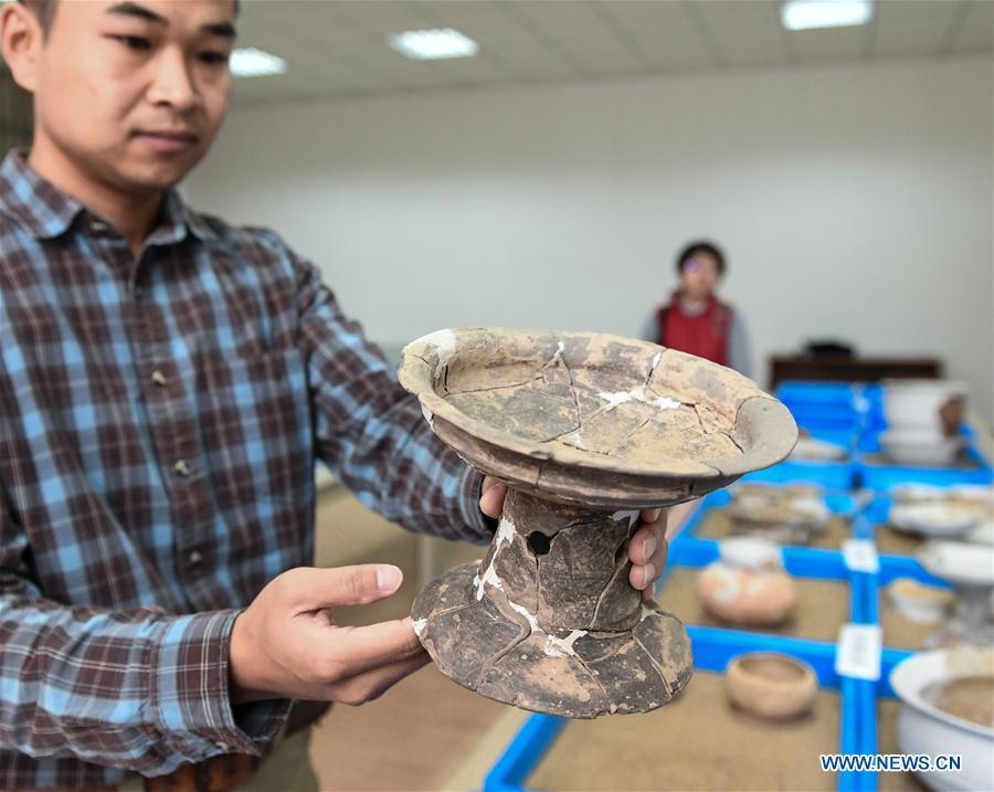 An archaeologist shows pottery found in the Nanshan ruins, southeast China's Fujian Province, Nov. 5, 2017. Chinese archaeologists have found a large amount of carbonized rice grains in caves dating from the New Stone Age, challenging the conventional view that cave dwellers were solely hunter gathers and did not cultivate land for food. (Xinhua/Li He)