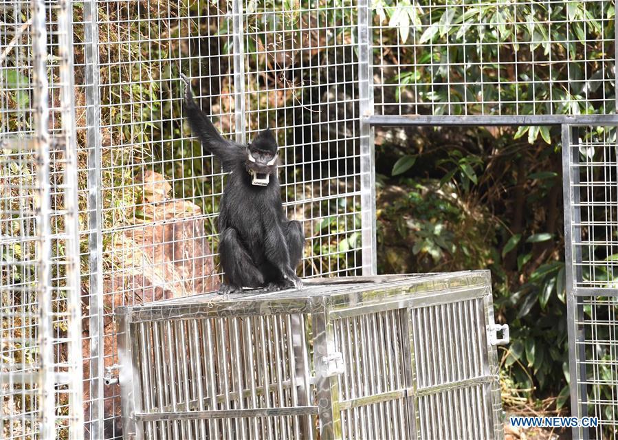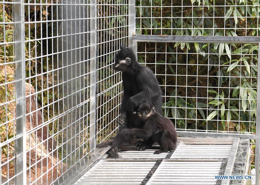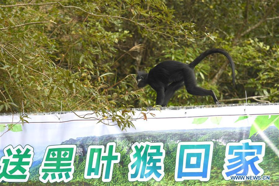 Two Francois leaf monkeys wait for being released in a training coop in Daming Mountain National Nature Reserve, south China's Guangxi Zhuang Autonomous Region, Nov. 6, 2017. Five artificially-bred Francois leaf monkeys, also known as black leaf monkeys, were released to the nature on Monday. (Xinhua/Zhou Hua)