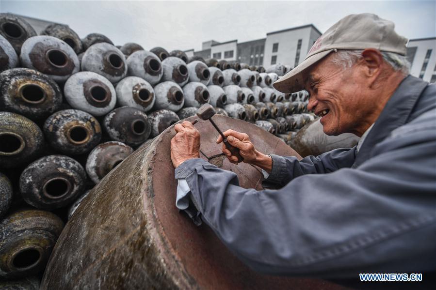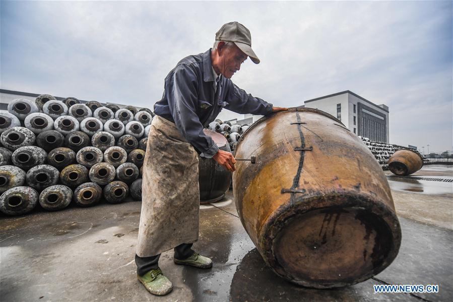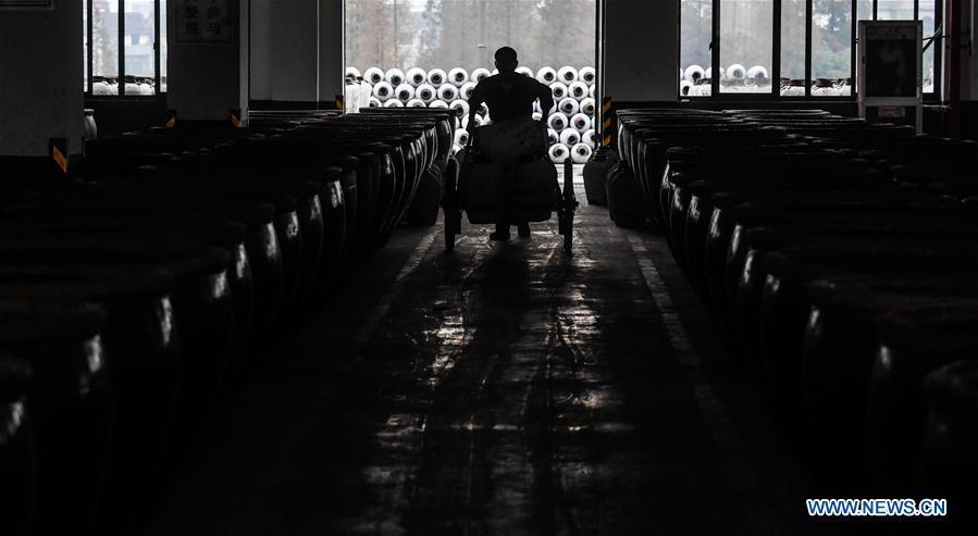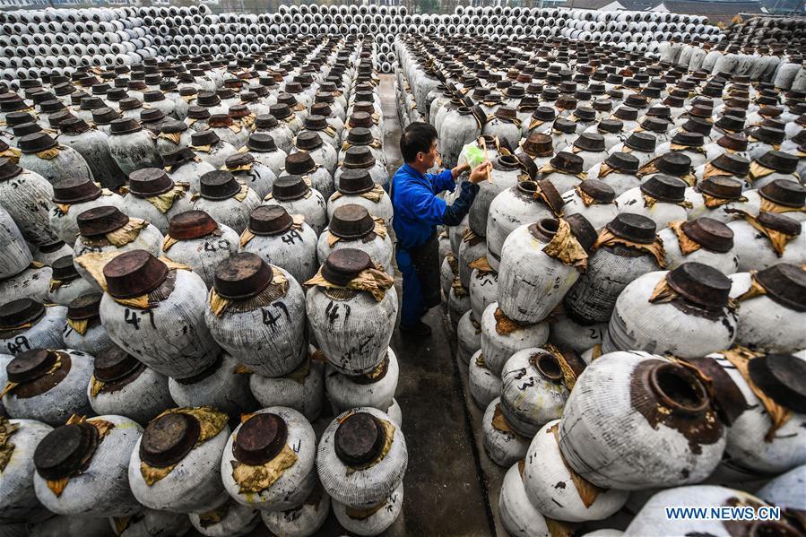 Workers work at a rice wine factory in Shaoxing, east China's Zhejiang Province, Nov. 7, 2017. With the arrival of "Beginning of Winter" on Nov. 7, a solar term on the traditional Chinese lunar calendar, the brewing of rice wine in Shaoxing City began. Rice wine is a pillar industry in Shaoxing, where 74 rice wine companies and more than 11,000 workers produce more than 600,000 tons of rice wine every year. Rice wine here is exported to more than 40 countries and regions, and the brewing technique was listed as one of the national intangible cultural heritages in 2006. (Xinhua/Xu Yu)