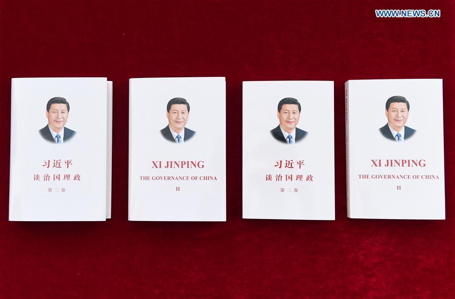 Photo taken on Nov. 7, 2017 shows the second volume of Chinese President Xi Jinping's book "Xi Jinping: The Governance of China", in Beijing, capital of China. The second volume of Chinese President Xi Jinping's book on governance has been published in both Chinese and English, the publisher said Tuesday. (Xinhua/Chen Yehua)