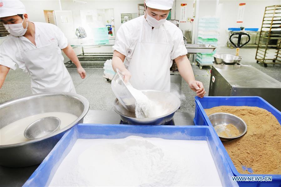 A cook arranges cookies made of glutinous rice, sugar, sesame and walnut at a factory in Nantong City, east China's Jiangsu Province, Nov. 8, 2017. The cookies are traditional snacks popular in Nantong. (Xinhua/Xu Congjun)