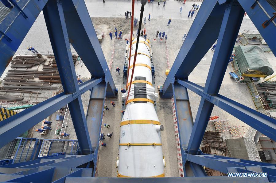 Staff members prepare to lift the Hualong One ZH-65 steam generator at the No. 5 unit of Fuqing Nuclear Plant, a project of the China National Nuclear Corporation (CNNC), in southeast China's Fujian Province, Nov. 9, 2017. Hualong One was jointly designed by China's two nuclear power giants, China General Nuclear Power Group and the CNNC, and passed inspection by a national panel in August 2014. (Xinhua/Song Weiwei)