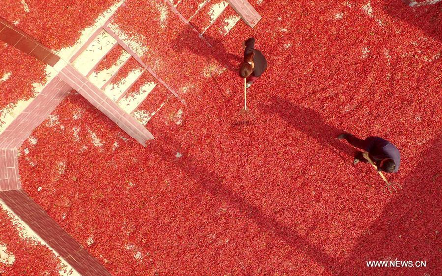Farmers dry peppers in Wanhuzhuang Village of Linxi County, north China's Hebei Province, Nov. 12, 2017. With plant area of more than 333 hectares, Linxi County saw a good harvest of chili pepper. (Xinhua/Zhu Xudong)