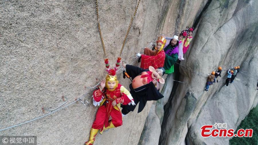 Chinese newlyweds pose for wedding photos dangling from a cliff at the Chaya Mountain scenic spot in the city of Zhumadian, central China's Henan Province, November 11, 2017. The scenic spot is famous for scenes shot there for popular TV series "Journey to the West" adapted from the classic novel of the same title. Staff dressed as iconic characters in the TV series, offering blessings to the young couple. (Photo/VCG)