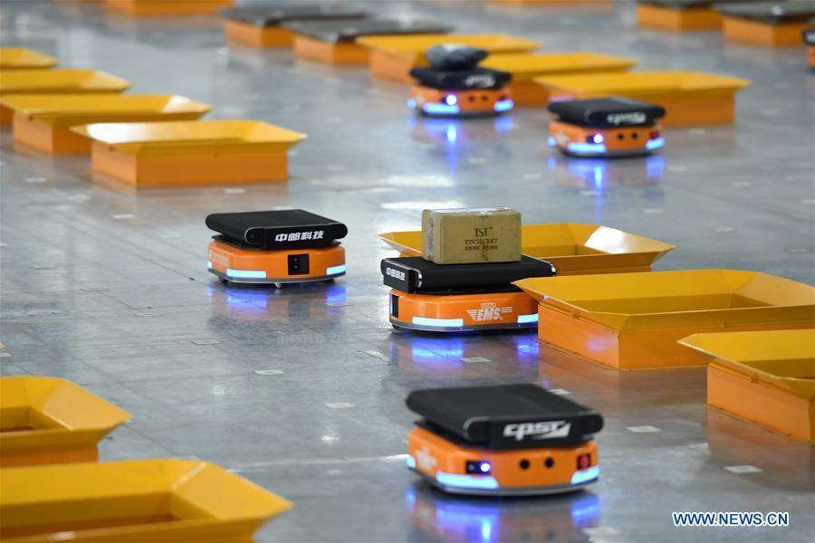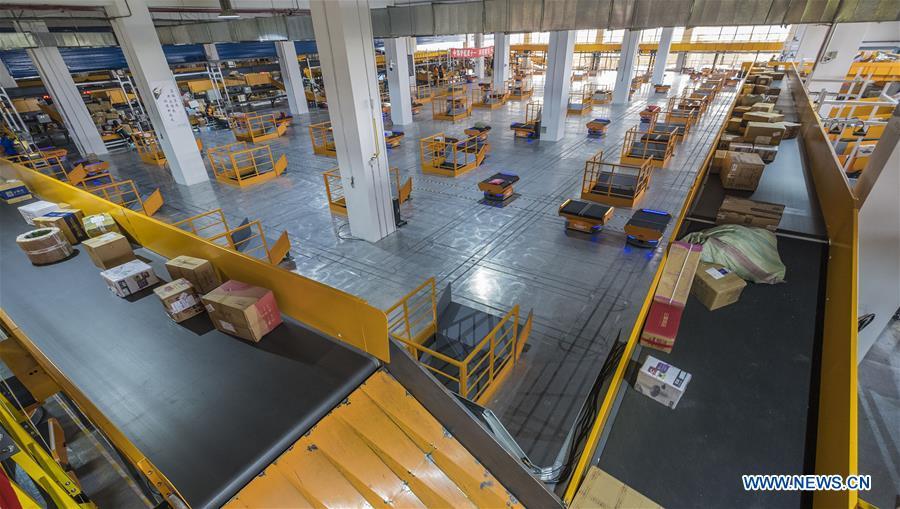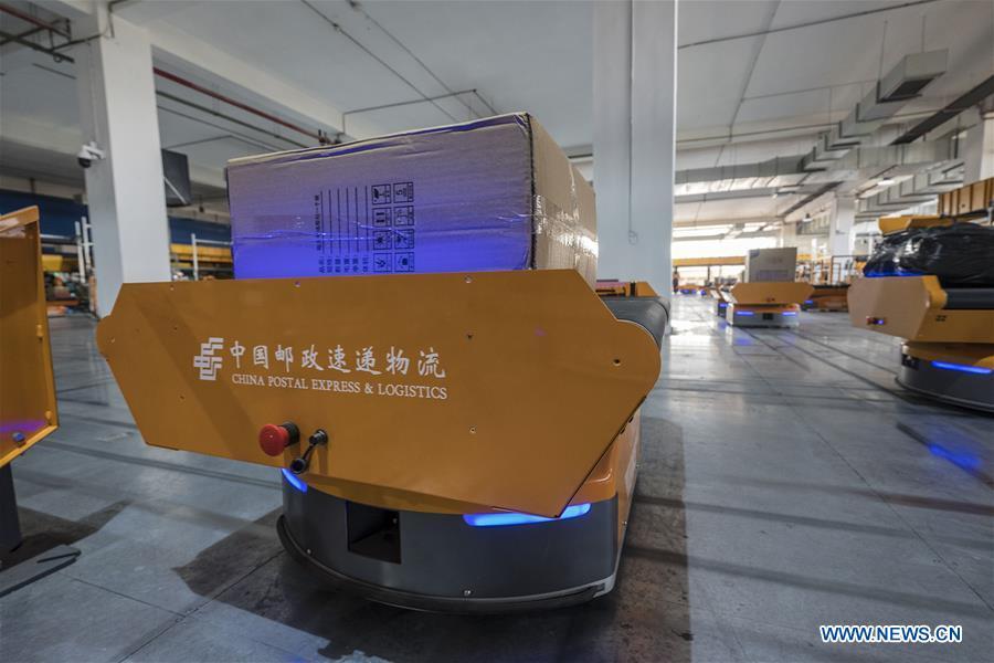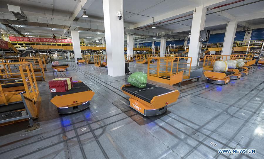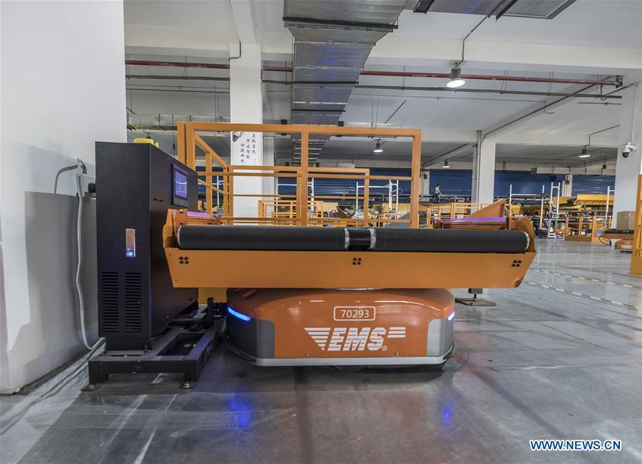 An automated guided robot recharges itself at Wuhan branch of China Postal express & logistics in Wuhan, central China's Hubei, Nov. 14, 2017. The branch has around 320 automated guided robots, which can help sort shipments, which provides efficient logistics services for online shoppers. (Xinhua/Hou Wenkun)