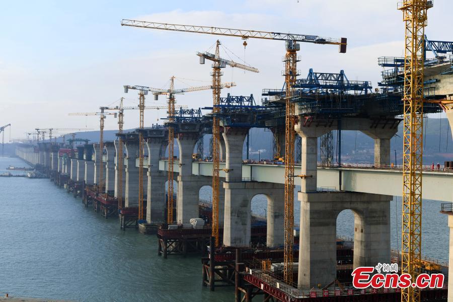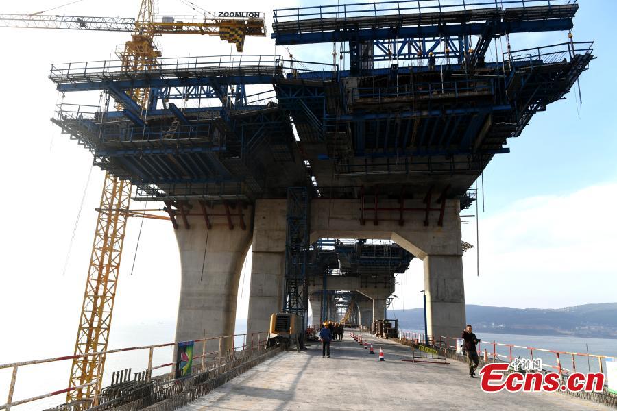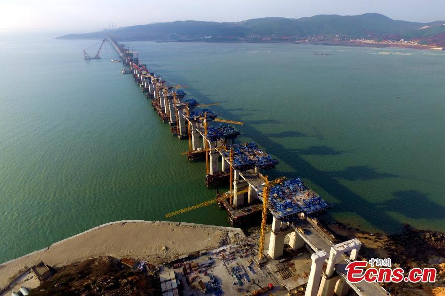 The pile foundation of total of 1,895 support pillars of Pingtan Haixia Rail-Road Bridge, China's first cross-sea rail-road bridge has been completed on Nov 16. The construction will go above ground after the underwater work has finished. The bridge has two layers, with the upper level carrying a six-lane highway and the lower level bearing a double-track railway. The 16.3-km-long bridge connects Fuzhou, capital of Fujian province, with the island city of Pingtan off the coast of the Taiwan Strait. (Photo: China News Service/Wang Dongming)