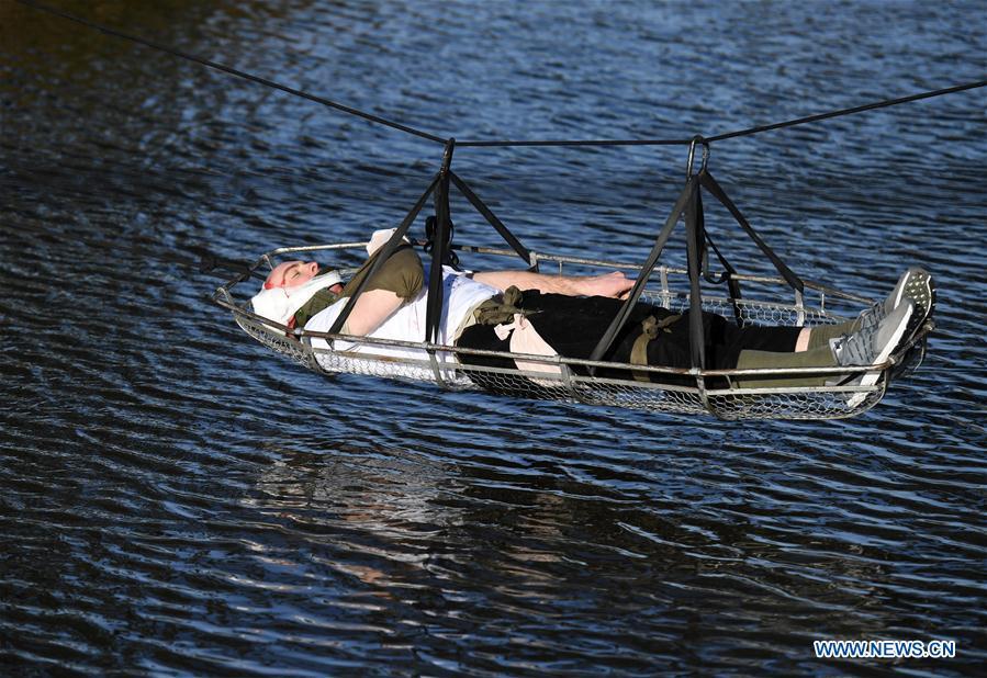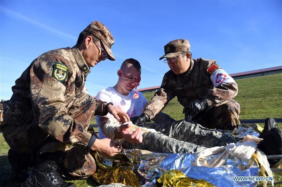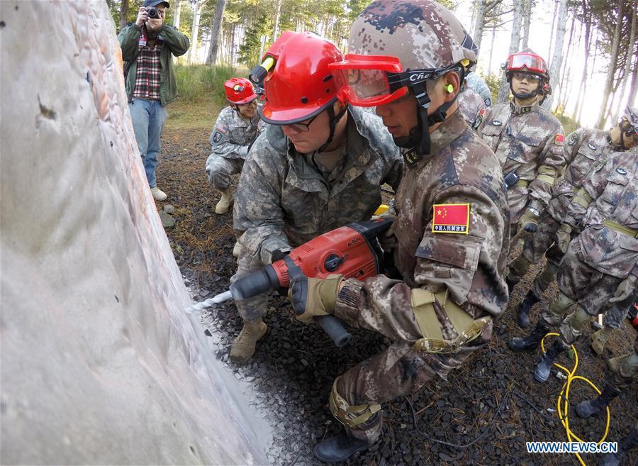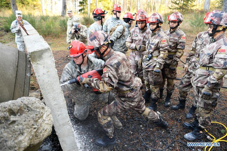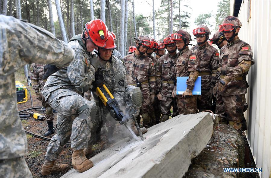 Chinese and American soldiers work together during a drill at Camp Rilea in Seaside of Oregon, northwest United States, Nov. 18, 2017. The Chinese and U.S. militaries were holding the 5th joint drills on humanitarian relief and disaster rescue in Oregon. (Xinhua/Yin Bogu)