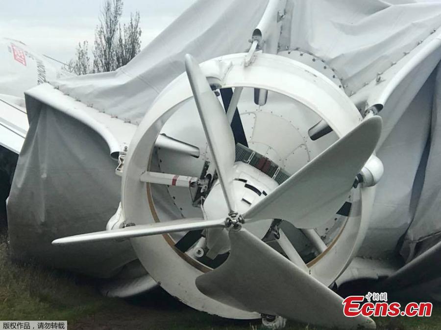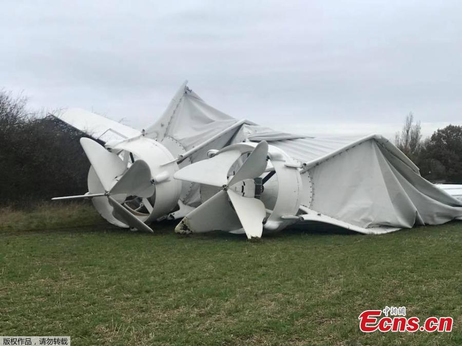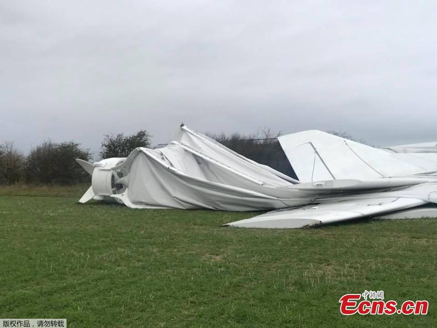Part of the collapsed airship Airlander 10 is seen in Bedfordshire, Britain on November 18, 2017. The world's longest aircraft was seen to "break in two" at an airfield in Bedfordshire, an eyewitness said.