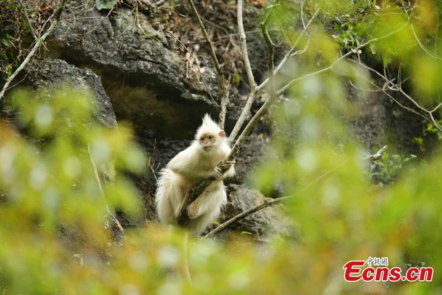 A female albino Francois' leaf monkey was spotted in a national reserve in south China's Guangxi Zhuang Autonomous Region, according to the management bureau of the reserve. There are fewer than 2,000 Francois' leaf monkeys worldwide. The International Union for the Conservation of Nature (IUCN) listed the animal as an endangered species in 2008. Zhou Fang, a professor from the college of animal science and technology at Guangxi University, said albinism is a natural phenomenon caused by gene deletion, and it is rare to see an albino Francois' leaf monkey in the region. (Photo: China News Service/Zhao Jiaxin)