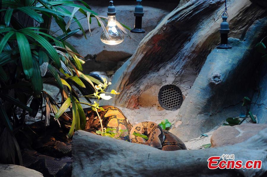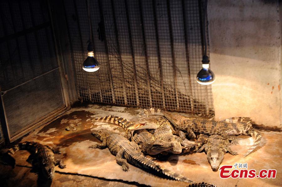 Photo taken on Nov. 21 shows several crocodiles under heat bulbs at Nanning Zoo of Guangxi Zhuang Autonomous Region on Nov. 21, 2017. (Photo: China News Service/Jiang Xuelin)