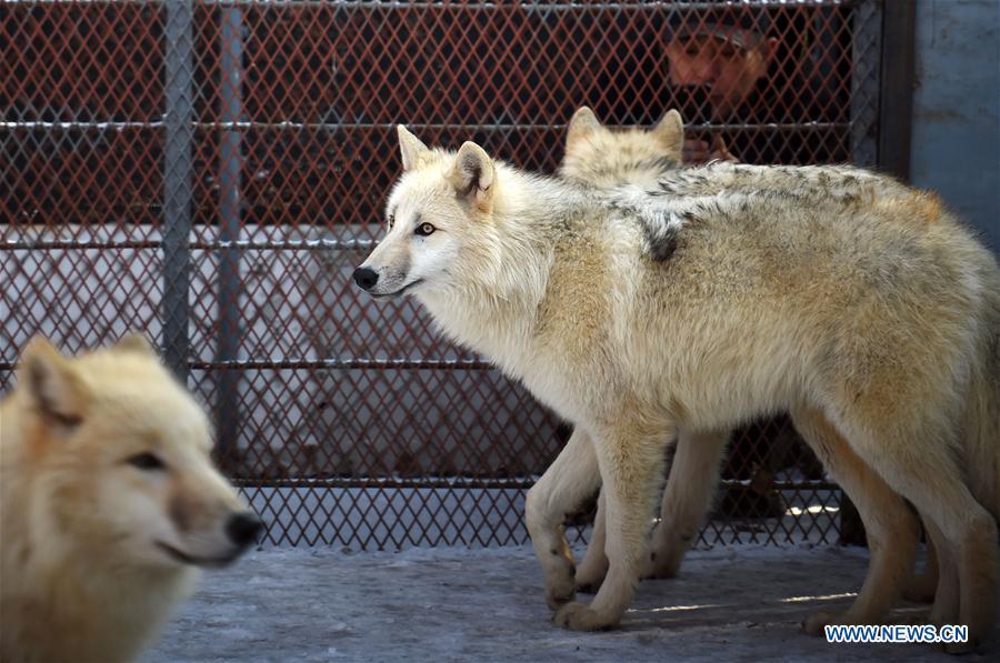 Arctic wolves pace at Harbin Polarland in Harbin, capital of northeast China's Heilongjiang Province, Nov. 22, 2017. Five arctic wolves from Serbia were introduced into the zoological park on Wednesday. (Xinhua/Wang Jianwei)