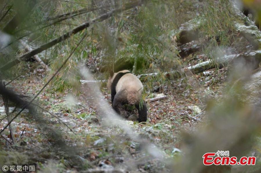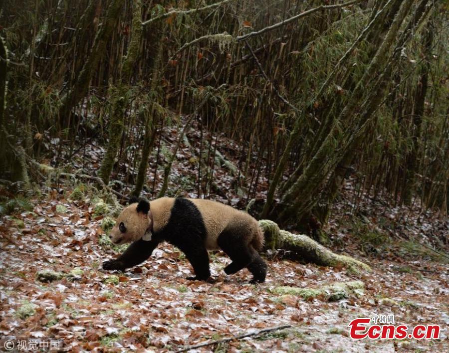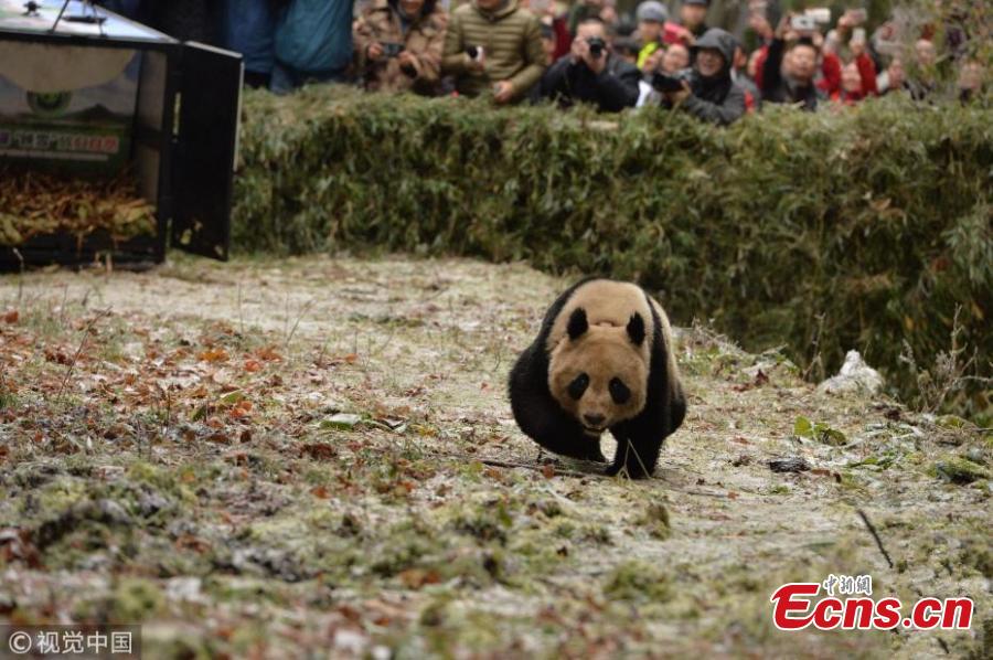 A pair of giant pandas are released into the wild at Liziping Nature Reserve in Ya'an, southwest China's Sichuan Province, November 23, 2017. China Conservation and Research Center for the Giant Panda said the captive-bred pair, a male and a female, had been in survival training for two years at Wolong. Ba Xi, the male, was born on July 26, 2015, and Ying Xue is just 14 days older. Ba Xi weighs 65 kg and is 107 cm long, while Ying Xue weighs 59 kg and is 89 cm long. The pair are both in good health. (Photo/VCG)