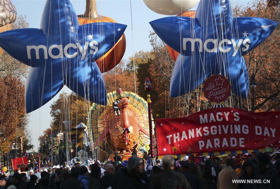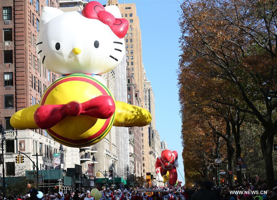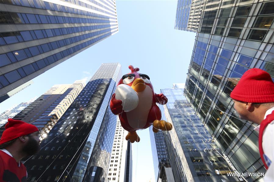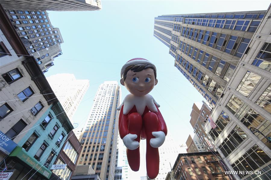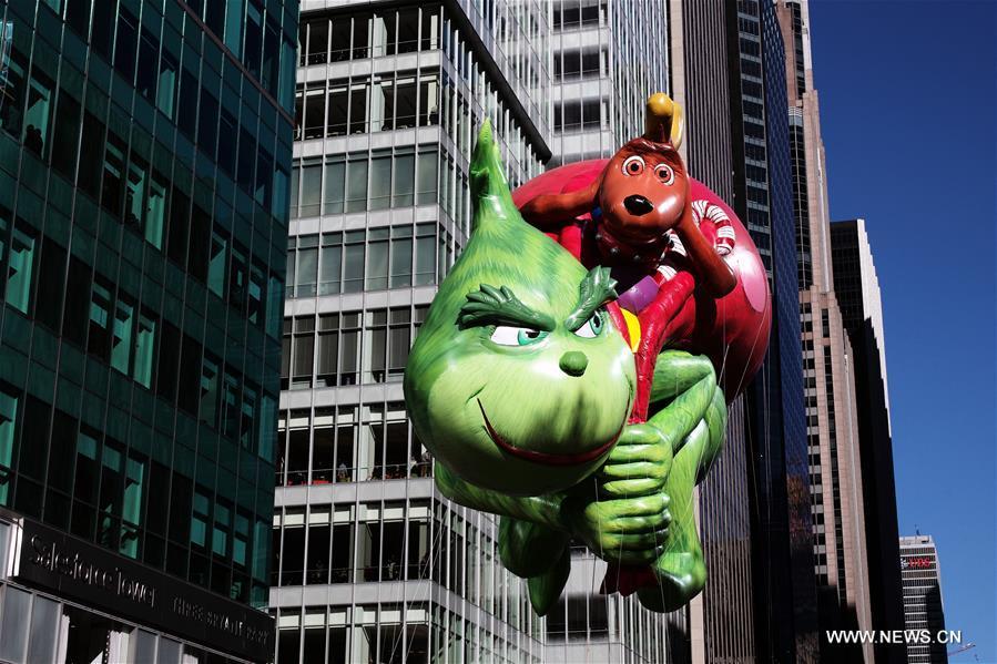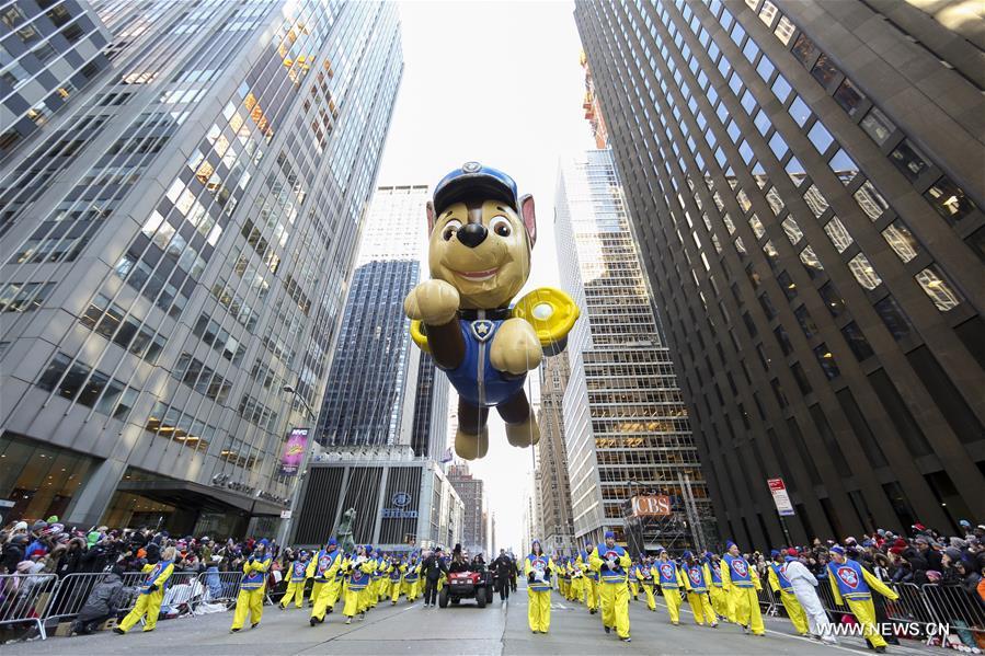 The balloon of Paw Patrol's Chase is seen during the 2017 Macy's Thanksgiving Day Parade in New York, the United States, on Nov. 23, 2017. (Xinhua/Wang Ying)