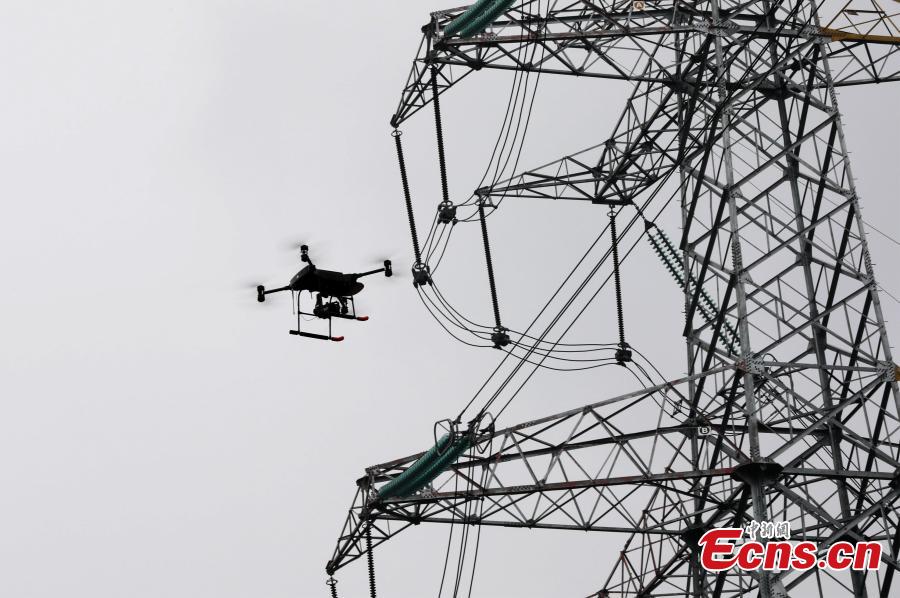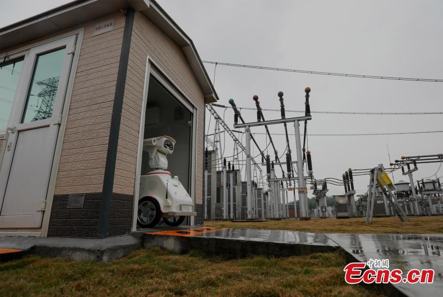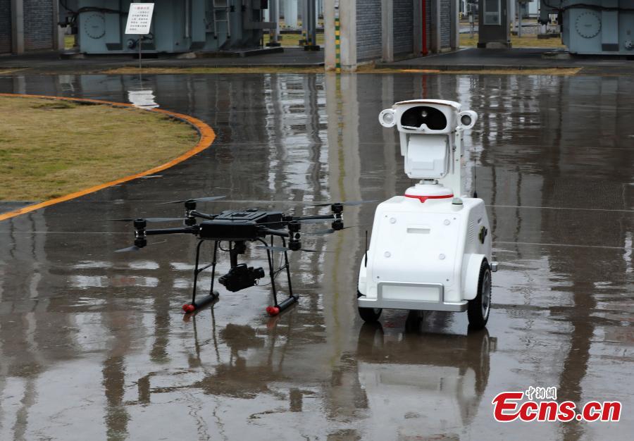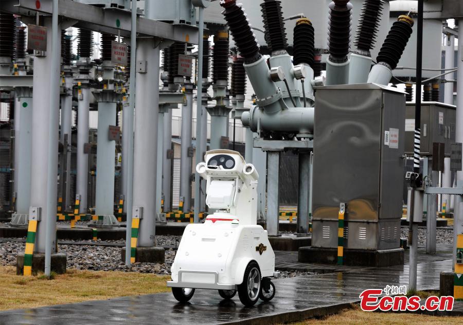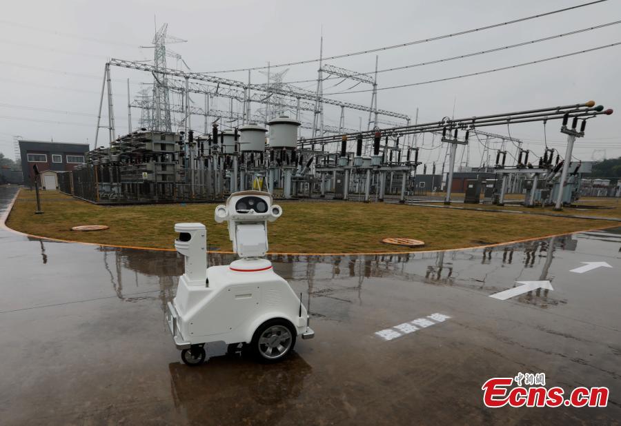 A robot inspects at a 500-kilovolt converter station in Shapingba district in Chongqing, Nov 23, 2017. The State Grid Chongqing Electric Power Company for the first time used a robot and an intelligent drone to inspect a transformer, which can help improve the inspection work.(Photo: China News Service/ Wang Yuan)
