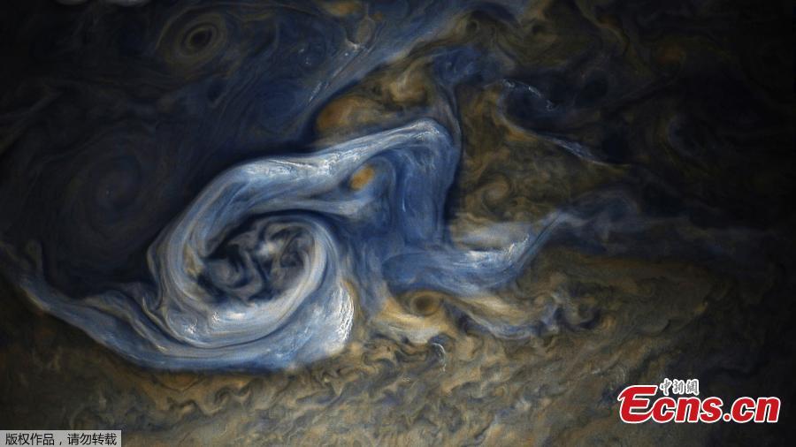 NASA’s Juno spacecraft has captured a breathtaking image of a raging tempest on Jupiter. Variations in the darkness of the clouds reveal what’s thought to be the depth of the storm, with darker clouds sitting deeper in the atmosphere. Juno spotted the turbulent scene during its ninth close flyby of the planet, from roughly 6,281 miles above the cloud tops. (Photo/Agencies)