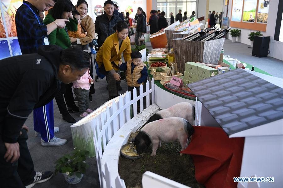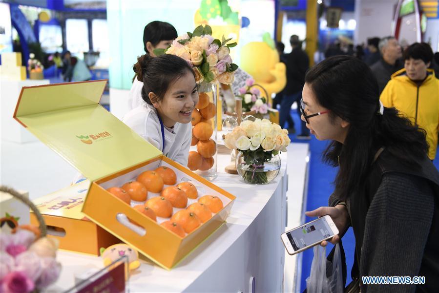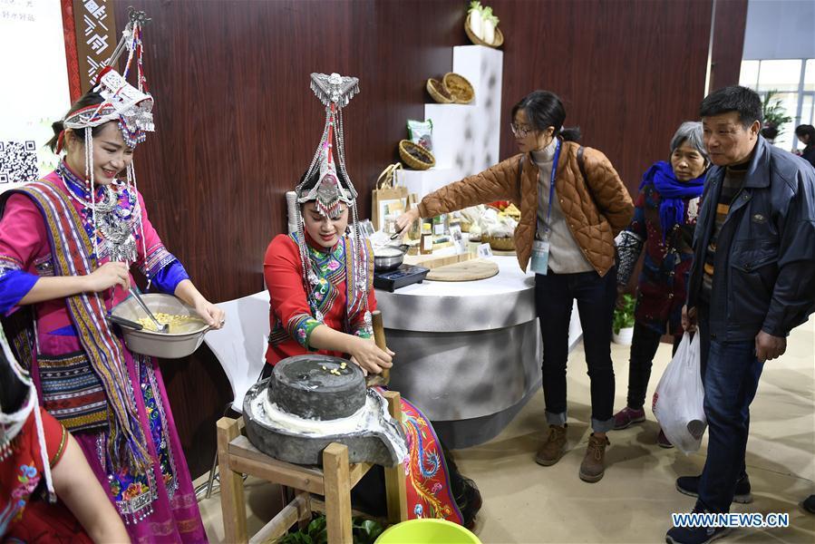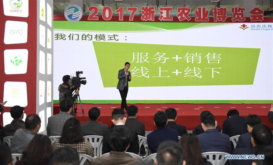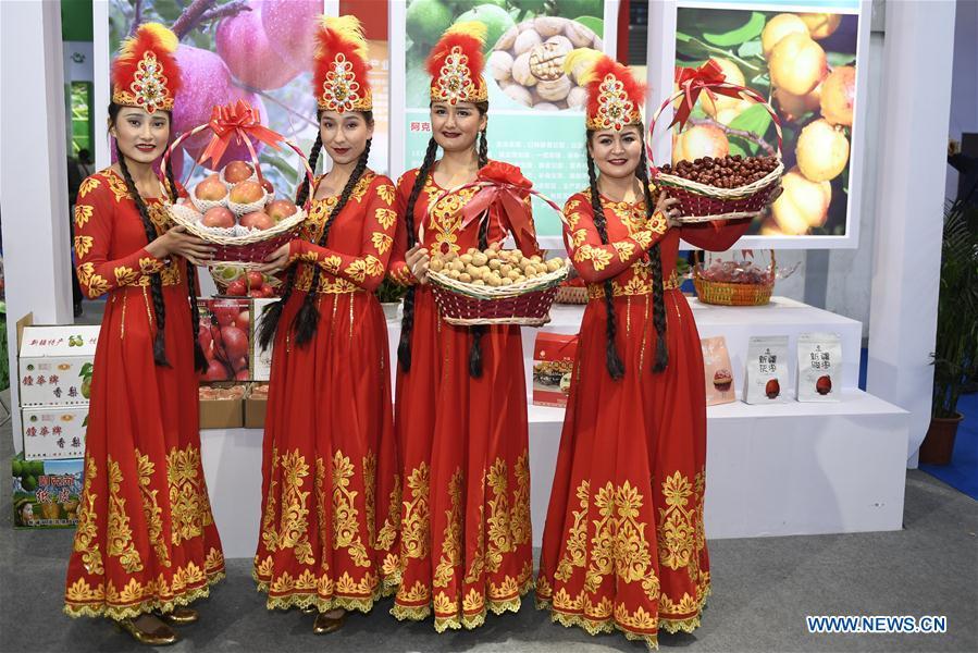 Exhibitors from Aksu of northwest China's Xinjiang Uygur Autonomous Region presents apples, walnuts and dates during the Zhejiang Agricultural Fair at the new Zhejiang Agricultural Exhibition Center in Hangzhou, east China's Zhejiang Province, Nov. 24, 2017. About 13,000 products from some 1,500 exhibitors are displayed at the five-day fair. (Xinhua/Huang Zongzhi)