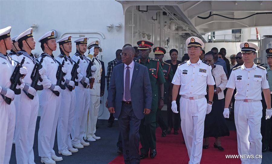 Tanzanian President John Magufuli (3rd R, front) inspects the guards of honor aboard Chinese hospital ship Peace Ark in Dar es Salaam, Tanzania, on Nov. 26, 2017. Tanzanian President John Magufuli on Sunday thanked Chinese doctors for treating more than 6,000 patients in the Chinese naval hospital ship Peace Ark during its eight-day stay in Tanzania's Dar es Salaam. (Xinhua/Jiang Shan)