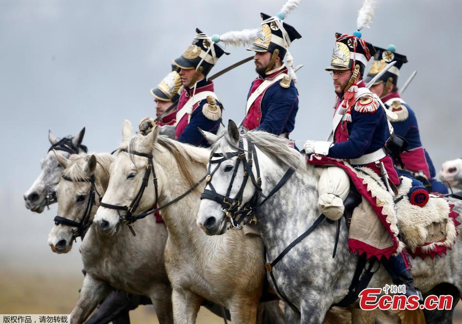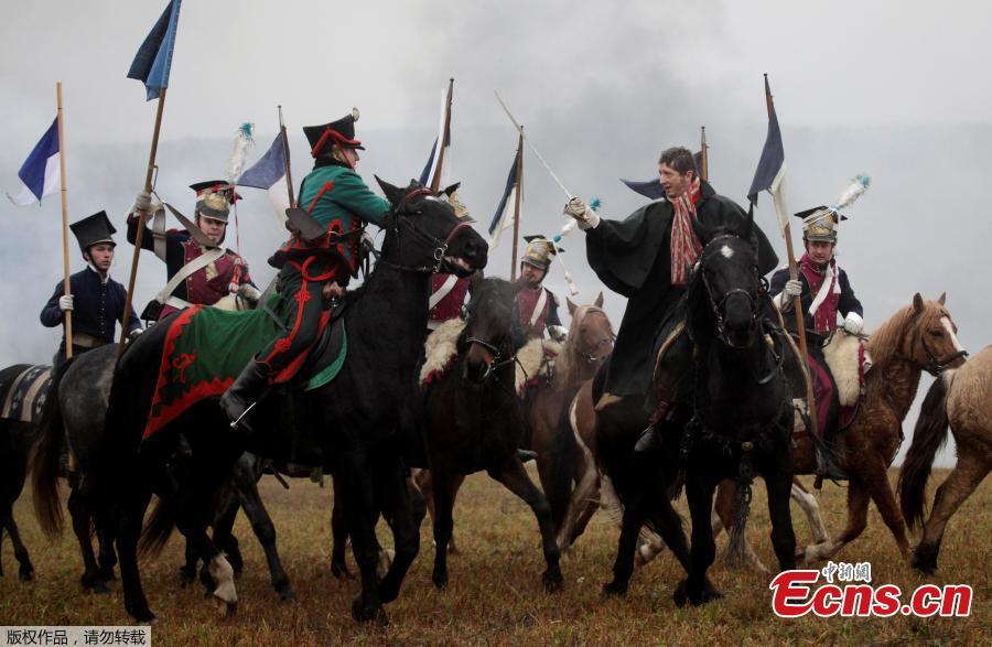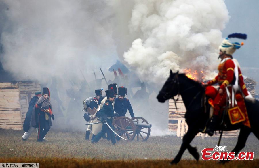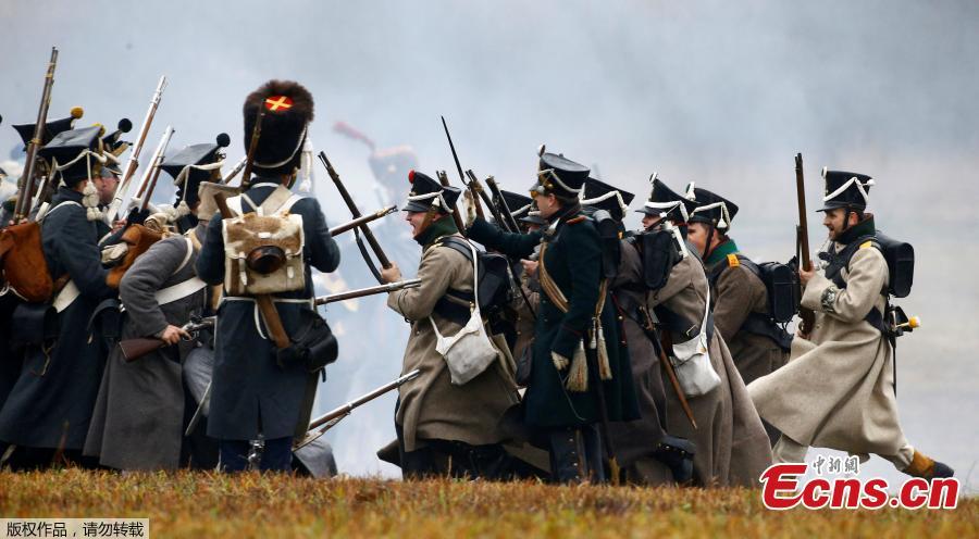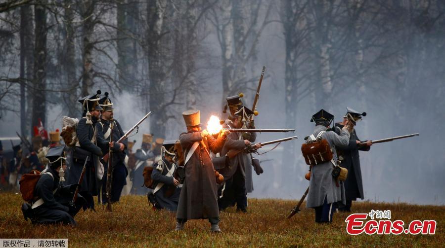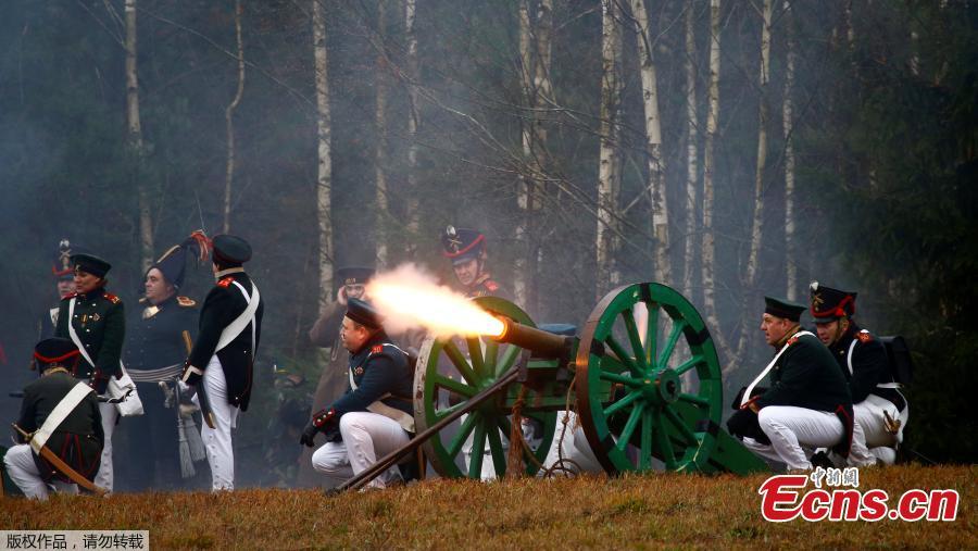 People dressed in the historic uniforms of the Imperial Russian and French armies take part in a re-enactment of the 1812 Battle of Berezina, to mark the 205th anniversary of the battle, near the village of Bryli, Belarus, November 26, 2017. (Photo/Agencies)