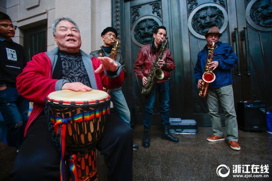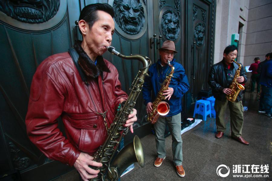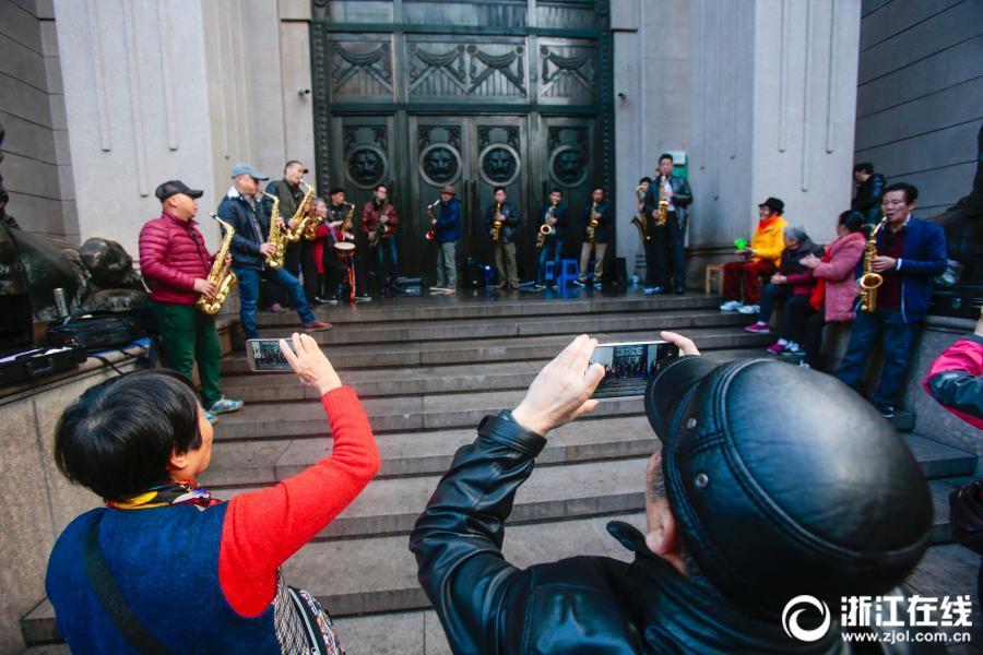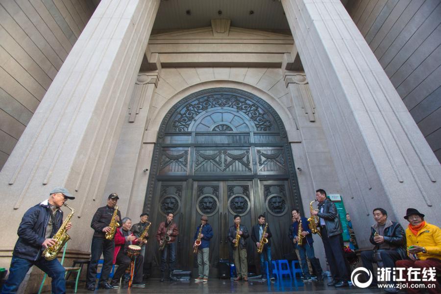 A saxophone orchestra formed of amateur players performs in front of a bank on Changqing Avenue in Hangzhou, East China’s Zhejiang province. The band has over 20 members, with an average age of 60. (Photo/zjol.com.cn)