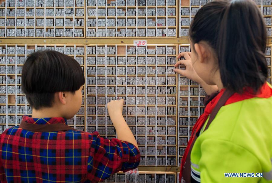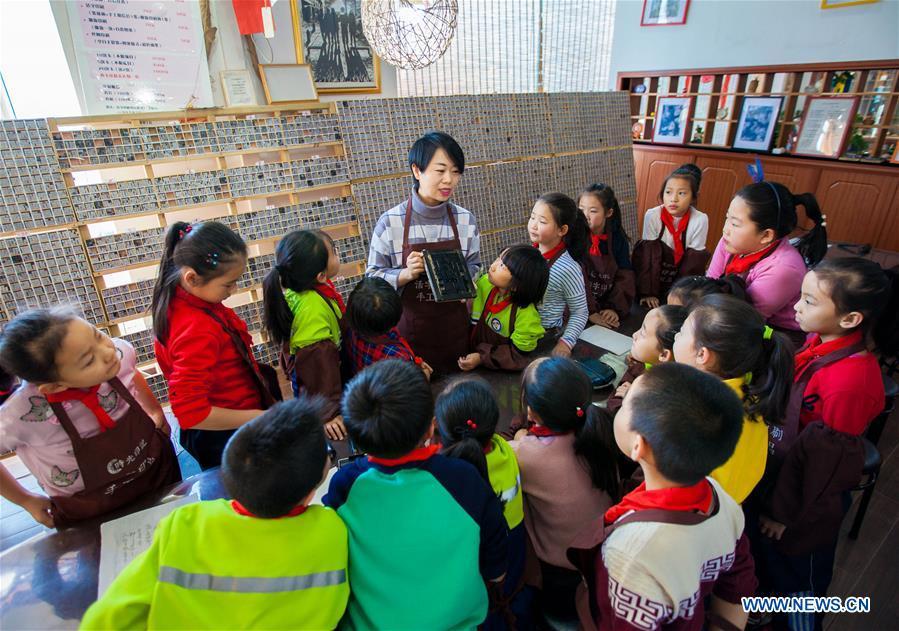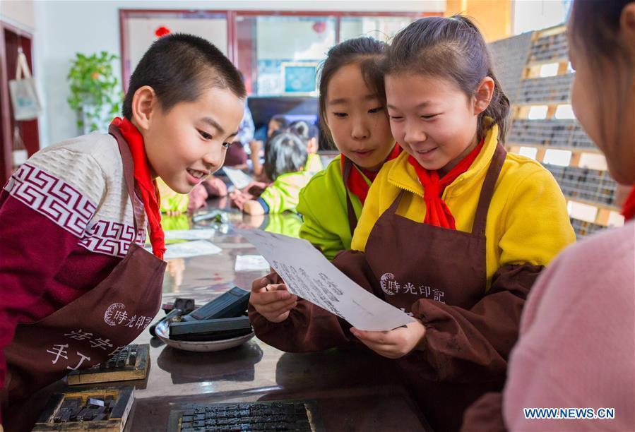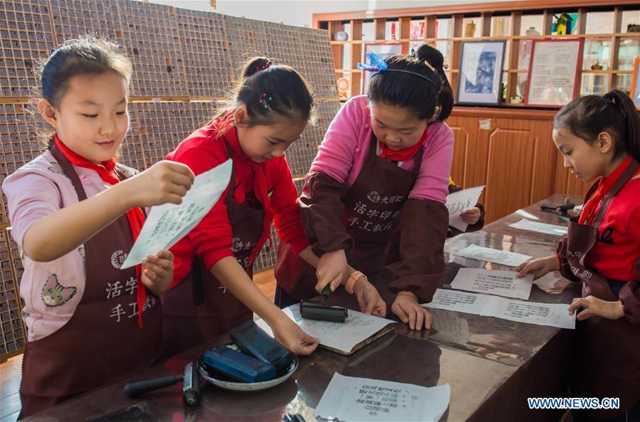 Pupils experience movable-type printing at a printing workshop in Yuquan District of Hohhot, capital of north China's Inner Mongolia Autonomous Region, Nov. 28, 2017. An activity was held on Tuesday for pupils to learn the movable-type printing, one of the world's oldest printing techniques invented in China. (Xinhua/Ding Genhou)