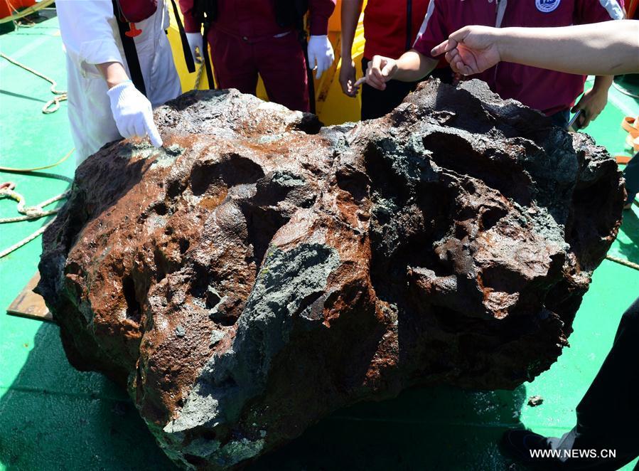 Photo taken on Nov. 30, 2017 shows a sulfide sample collected from the south Atlantic. Xiangyanghong 01, China's elite science ship, on Thursday collected the sulfide sample weighed around 3 tons, which is the biggest one of its kind in the country. (Xinhua/Zhang Xudong)