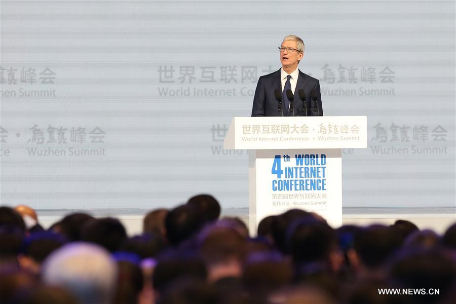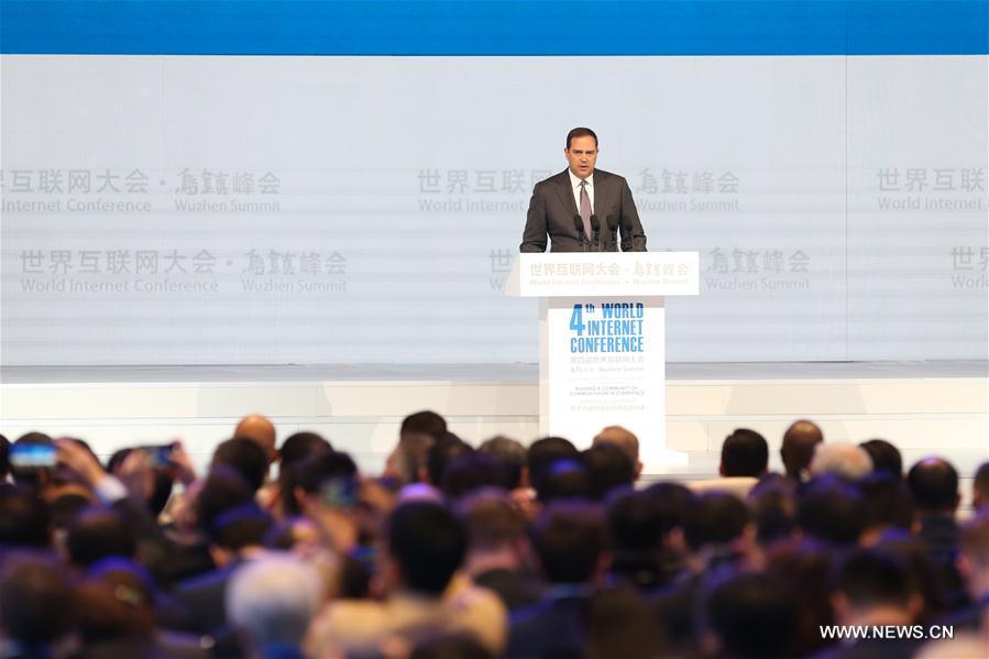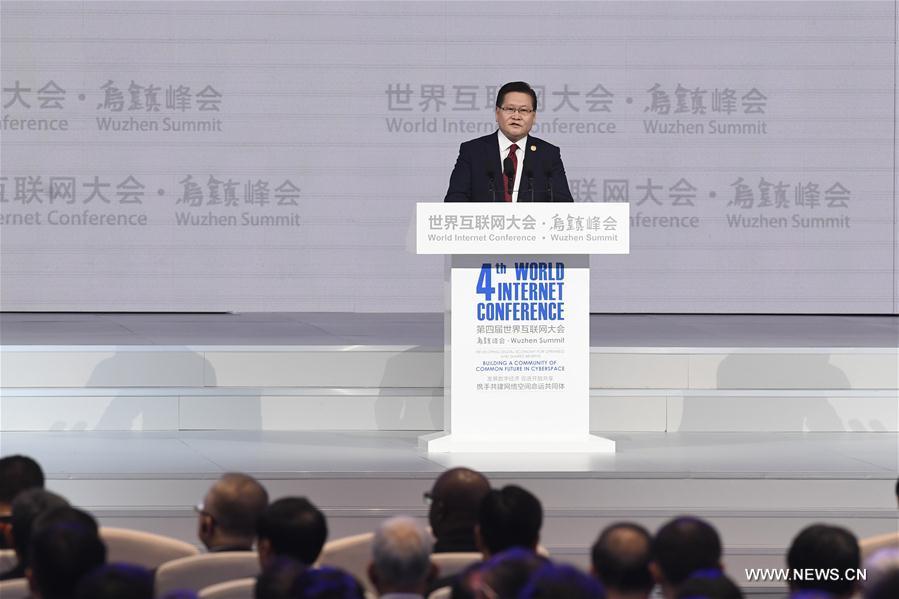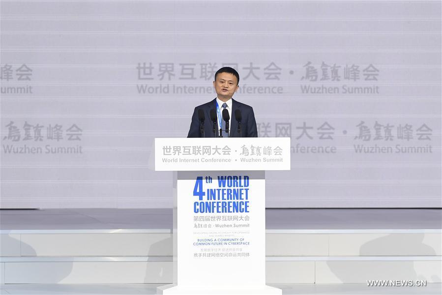 Jack Ma, chairman of Alibaba Group, addresses the opening ceremony of the Fourth World Internet Conference in the water town of Wuzhen, east China's Zhejiang Province, Dec. 3, 2017. (Xinhua/Huang Zongzhi)