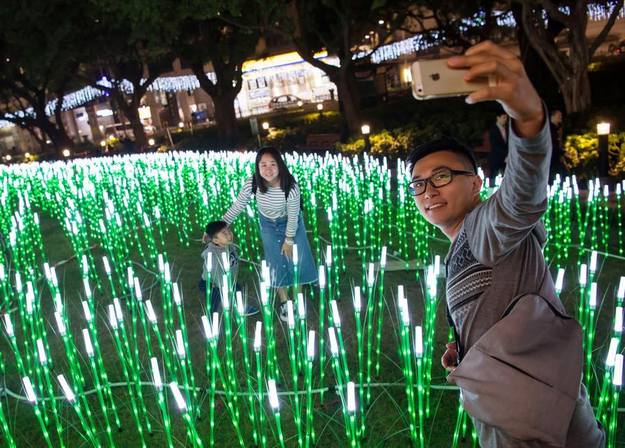 Visitors take pictures of light show during the Macao Light Festival 2017 at the Ruins of St. Paul's in Macao, on Dec 3, 2017. The Macao Light Festival 2017, an annual event put on by the special administrative region's government, was unveiled at the Ruins of St. Paul's on Sunday night, followed by a string of events and festivals to attract tourists. The 17th century Portuguese Church of St. Paul is among Macao landmarks listed as a UNESCO World Heritage Site.(Photo: Xinhua/Zhang Jinjia)