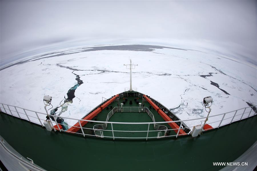 An iceberg is seen in front of China's research icebreaker Xuelong, or Snow Dragon, in the Antarctic Circle, Dec. 3, 2017. Xuelong has entered the Antarctic Circle as of press time. It set sail from Shanghai, east China, on Nov. 8, beginning the country's 34th Antarctic expedition. Researchers will conduct preliminary work on China's fifth station in the Antarctica, which is one of the key objectives of this expedition. (Xinhua/Bai Guolong)